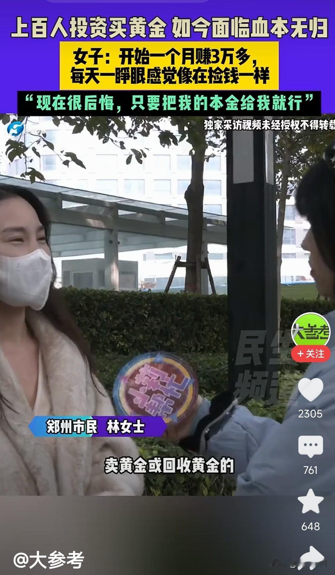 在黄金市场上都想赚钱,除非你特别有实力,要不然,你真的容易掉进去,赔的血本无归。 靠买黄金赚差价,风险太大,一般人把握不住,这女子最开始就像捡钱一样,睡一觉,睁开眼就赚钱了,一个月好几万。这样的好事都是有风险的。 因为你赚的钱也是别人放出来的诱饵,都在放长线钓大鱼,挣钱不是这么简单的,睡一觉醒来就赚钱,这也太简单了吧,简单的事情是有缘故的。 你赚钱的时候人家在准备怎么赚你的钱呢?机会成熟了,你再睡醒的时候一切都变了,轮到别人睡醒的时候看赚钱了。大鱼吃小鱼,小鱼吃虾米的规律出来了。 在任何时候赚钱就没有轻松的,轻松的那不是钱,是风险。