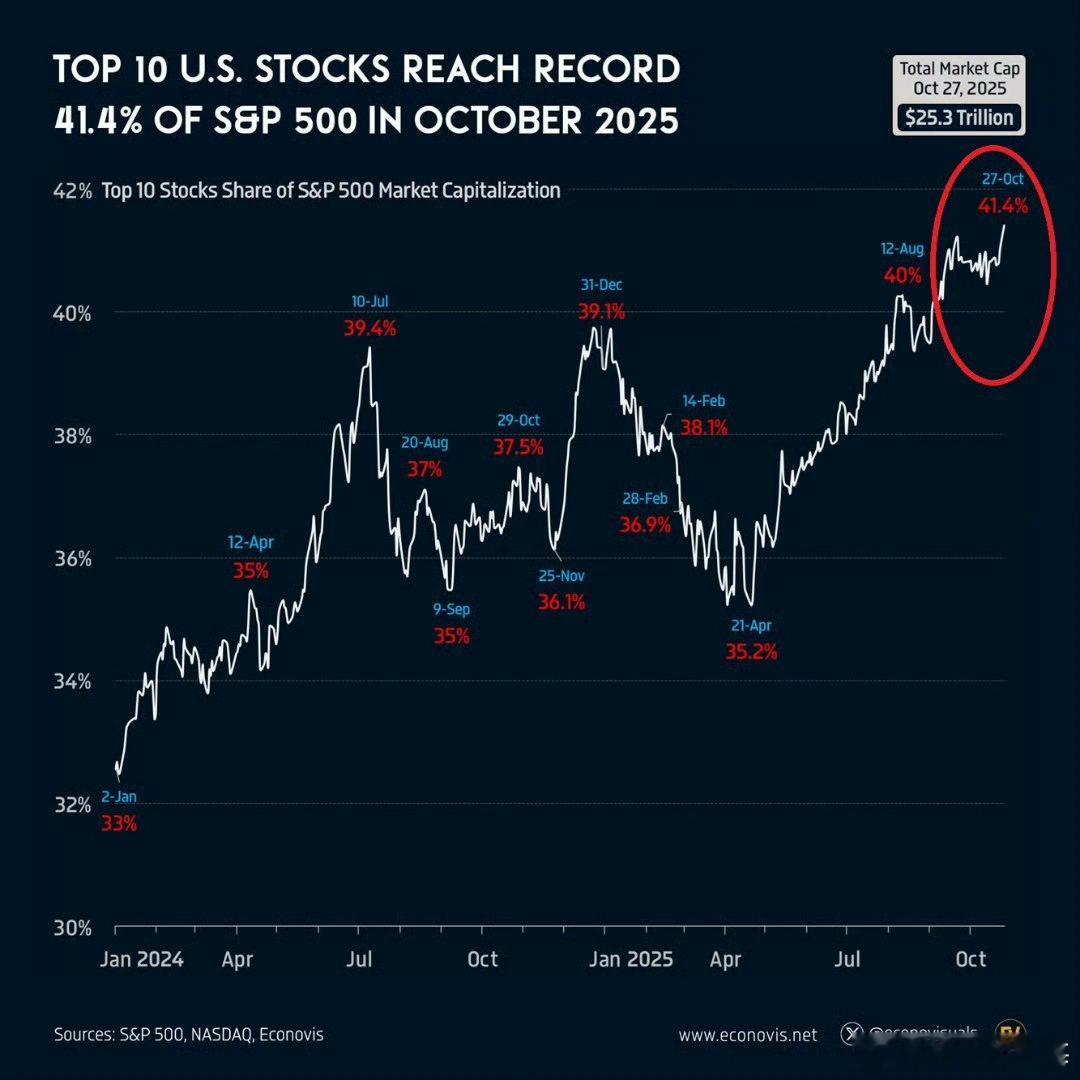 美国股市的集中度再创历史新高。当前,美国前10大股票占标普500指数市值达到41.4%。 它们的总价值已飙升至25.3万亿美元以上。 同时,41个公司和人工智能相关股票占标普500指数市值达到47%。