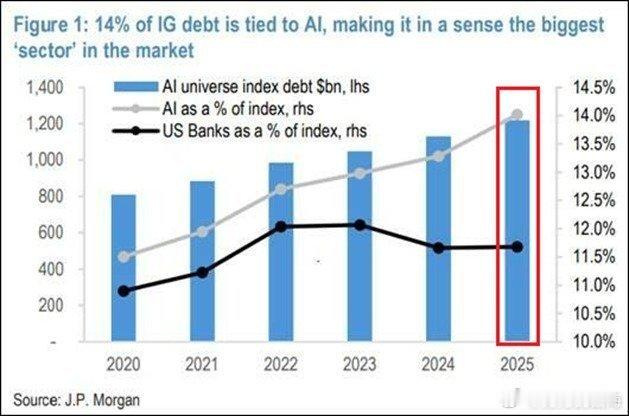 人工智能公司的债务正在成为美国债券市场的主角。目前,与人工智能相关公司在债券指数中的占比达到创纪录的14%,超过了银行业大约11.5%的权重。