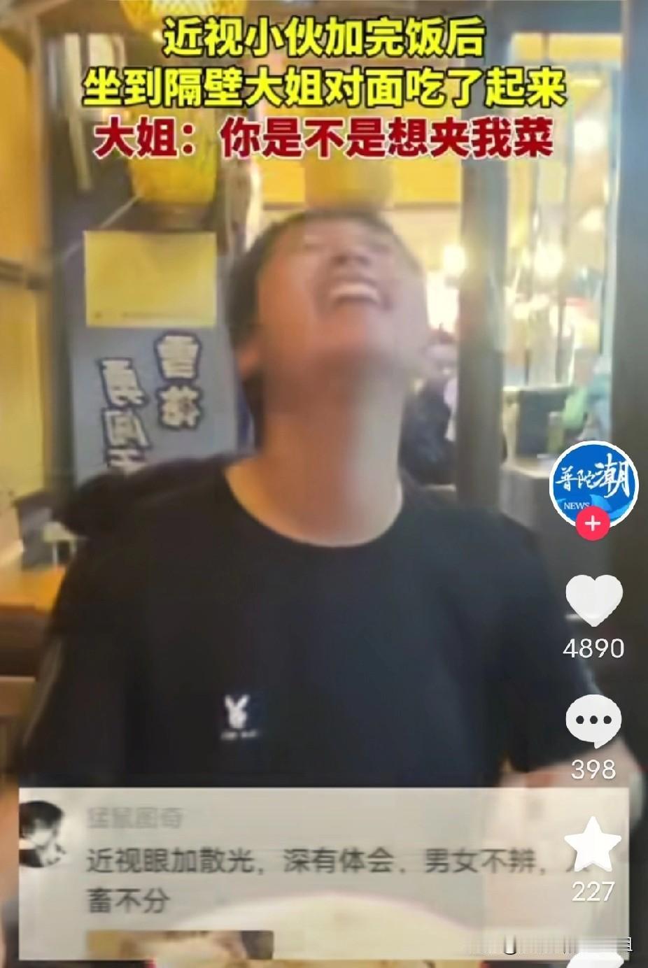 幸亏跑得快!湖北一男子和朋友吃夜宵,结果因为近视,坐错了桌子,当他听到朋友的喊声,懵圈的一抬头,一刹那眼睛眯成一条缝,再看了一眼面前的人,瞬间社死,尴尬的抱着碗回到自己桌!网友:他一眯眼我就知道他不是装的! 视频里能清楚看到,这哥们起身加完调料,迷迷糊糊就坐到了隔壁桌,还对着一碗陌生的面吃得挺香。最绝的是,真正坐在那个位置上的陌生大哥,居然也没吱声,两个人就这么安安静静地“共进”了一小段晚餐,直到他朋友在邻桌憋不住笑出声来。那种听到呼唤后下意识眯起眼睛、努力辨认的瞬间,简直是所有近视朋友的统一招牌动作。有网友讲得特别对,很多近视加散光的人,不是高冷,是真的分不清眼前走过的是熟人还是棵行道树,判断要不要打招呼,全靠对方先开口。这种日常的“小迷糊”,一下子拉近了屏幕前后所有人的距离。 不过笑过之后,再咂摸一下这个场景,会发现里面有些特别温暖的东西。坐错位置的男子,被他“霸占”了座位的陌生食客,还有记录下这一切的朋友,整个过程中没有人生气,没有人指责,只有一种善意的理解和忍俊不禁。陌生人的宽容和朋友的调侃,把一场可能的“社死”危机,变成了一件可以让大家会心一笑的趣事。这种人与人之间小小的默契和宽容,在当下这个容易紧绷的社会里,显得特别难得。它告诉我们,不是所有意外都需要上升到冲突,有时候,一点幽默感就能化解所有的尴尬。 其实从古到今,近视带来的这类尴尬就一直没断过,但人们对它的看法却变了很多。看看老笑话里,近视眼常常是被嘲弄的对象,比如有人把街上的牛粪当成掉落的盒子伸手去捧,还有人因为看不清匾额上的字而闹出大笑话。那会儿可没有现在这么方便的眼镜,近视的读书人不但生活不便,还可能要承受周围人的指指点点。对比一下,现在咱们看待这件事的态度就轻松多了,甚至带点自嘲的亲切感。就像女明星张予曦,在机场因为近视眯眼认不清人,全程表现得像只警惕的小猫,直到凑近才认出队友,这个“社死瞬间”非但没掉粉,反而因为特别真实,让她收获了更多好感。大家不再觉得这是个值得嘲笑的缺陷,反而当成一种可爱的、有共鸣的个人特质。 这个湖北小伙子的遭遇,之所以能引发这么广泛的传播和善意的笑声,正是因为它不完美,因为它真实。它打破了网络世界里常常充斥的精心修饰过的滤镜,露出了普通人生活里共通的、毛茸茸的底色。在这个人人都想展示最完美一面的时代,这种不经意流露出的“人味儿”,反而成了最打动人的东西。张予曦的“迷糊”让她从“仙女”变成了邻家女孩,而这个吃宵夜的小伙子,也让我们看到了那个可能在餐厅里看菜单需要掏出手机拍照放大的自己。 回过头看,这件小事之所以能成为一个让大家快乐讨论的话题,本质上是因为它映照出了我们共同的经历。它让我们看到,社会其实可以在一种更温和、更包容的氛围里运行。一点点理解,一点点自嘲,就能让世界变得可爱很多。毕竟,谁还没在五米外认错过人呢?这份真实的“模糊”,或许正是让我们彼此靠得更近的粘合剂。 各位读者你们怎么看?欢迎在评论区讨论。