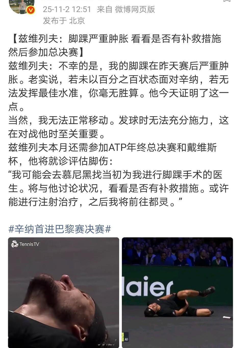 辛纳6-0/6-1赢下紫薇还得感谢梅德韦杰夫,德雷珀如果能参加总决赛,是梅总磨走了紫薇全部精力。 兹维列夫:脚踝严重肿胀,看看是否有补救措施,然后参加总决赛。