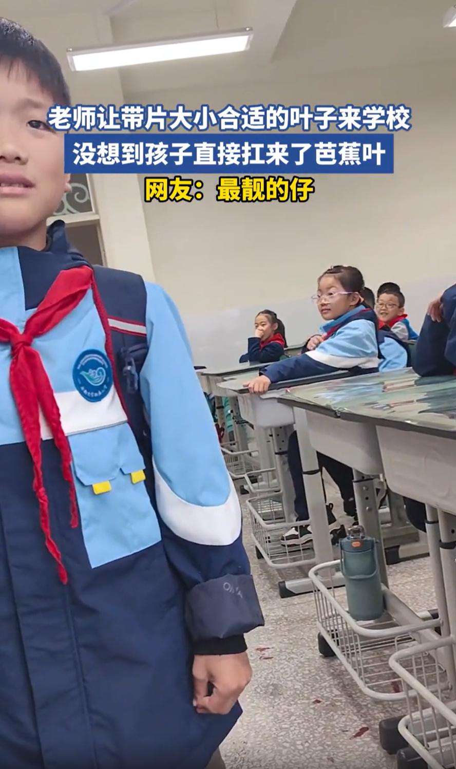 太好笑了!四川,老师在放学前布置了一个特别的作业,让每个学生第二天带一片叶子来上课,说是要用来做课堂活动。结果第二天,全班的孩子都乖乖带来了枫叶、银杏叶、小草叶,唯独一个男孩姗姗来迟,扛着一片比自己还高的芭蕉叶,晃悠悠地进了教室,老师都蒙了:你带这个干嘛! 视频里,班上的同学早上都已经到了自己的座位上,就只有这名男孩姗姗来迟,不过他的造型也是最特别的,扛着一个比自己还高的芭蕉叶走进班级,甚至上面还能看到露水,看得出来是早上刚砍下来的 班主任一时没反应过来,还以为他是来做美术展的,询问道:你拿这个干嘛? 男孩有点腼腆,小声回答:老师说要带一片大小合适的叶子,我觉得这片叶子挺合适的 此话一出,全班笑成一片,老师也忍不住笑了出来 这事虽然搞笑,但仔细一想,其实挺有意思。成年人习惯用自己的标准去理解“合适”两个字,可在孩子眼里,合适的标准完全不一样。你说要带叶子,他就真的带了叶子;你说要合适,他就按自己的理解去选最大的那片。孩子的世界没有那么多“差不多”的模糊标准,他们理解事情往往是最直接、最纯粹的 这个扛着芭蕉叶的孩子,也许在别人眼里是个笑料,但在我看来,他是最有执行力的学生。他认真地听话、认真地完成任务,甚至认真到带来了全校最大的那片叶子。这样的“实在”,在孩子身上是可爱的,在成年人身上则是难得的 老师让带叶子 孩子直接扛来芭蕉叶