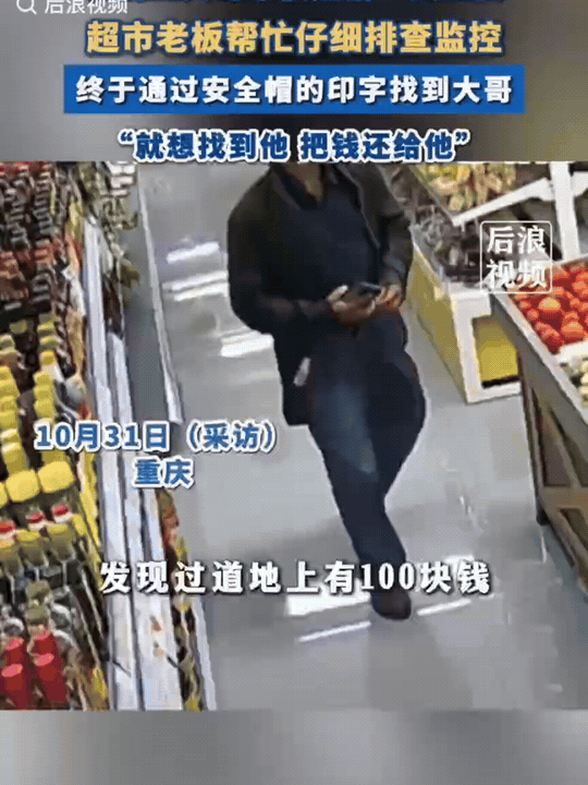“不发财都难!”重庆,超市老板陈先生在过道的地上发现100元钱。为了找到丢钱的人,就去查看监控视频。他看到有一个带着工地安全帽的人,从兜里掉出了一张现金。他一看是一名农民工,他想着他们挣钱太不容易了。 陈先生就想尽快找到人。他继续查看监控,终于有一个画面,清晰的拍到了安全帽上的字。他知道这个工地,就在超市对面不远的地方。 第二天他就去工地上找人了。可是光有不太清晰的监控截图,工地上有许多人。他只能见到人就问,转了两圈,问了3拨人后,终于找到了丢钱的人。 丢钱的农民工说,丢了钱,他一晚上没有睡着。因为他干的是小工,一天也就100多元钱。所以,丢100元钱,自己挺心疼的。 没想到,还能找到。超市老板为了还给他这100元钱。也是费了一些功夫的。为善良的老板点赞! “拾金不昧”是我们每个人从小就知道的事情。曾经小时候经常听的儿歌就是“我在马路边,捡到一分钱,交给警察叔叔手里边。”希望这样的美德代代传承下去。