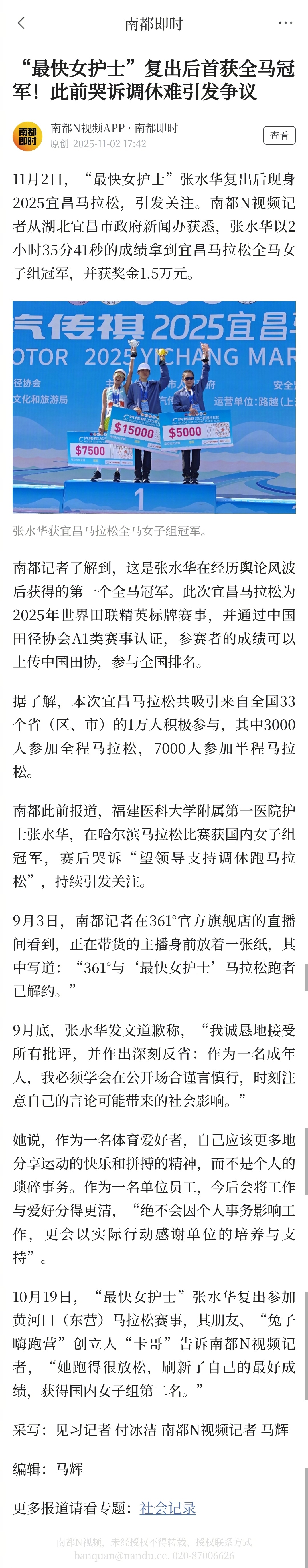 【“最快女护士”复出后首获全马冠军!此前哭诉调休难引发争议】#最快女护士风波后首获全马冠军#11月2日,“最快女护士”张水华复出后现身2025宜昌马拉松,引发关注。南都N视频记者从湖北宜昌市政府新闻办获悉,张水华以2小时35分41秒的成绩拿到宜昌马拉松全马女子组冠军,并获奖金1.5万美元。