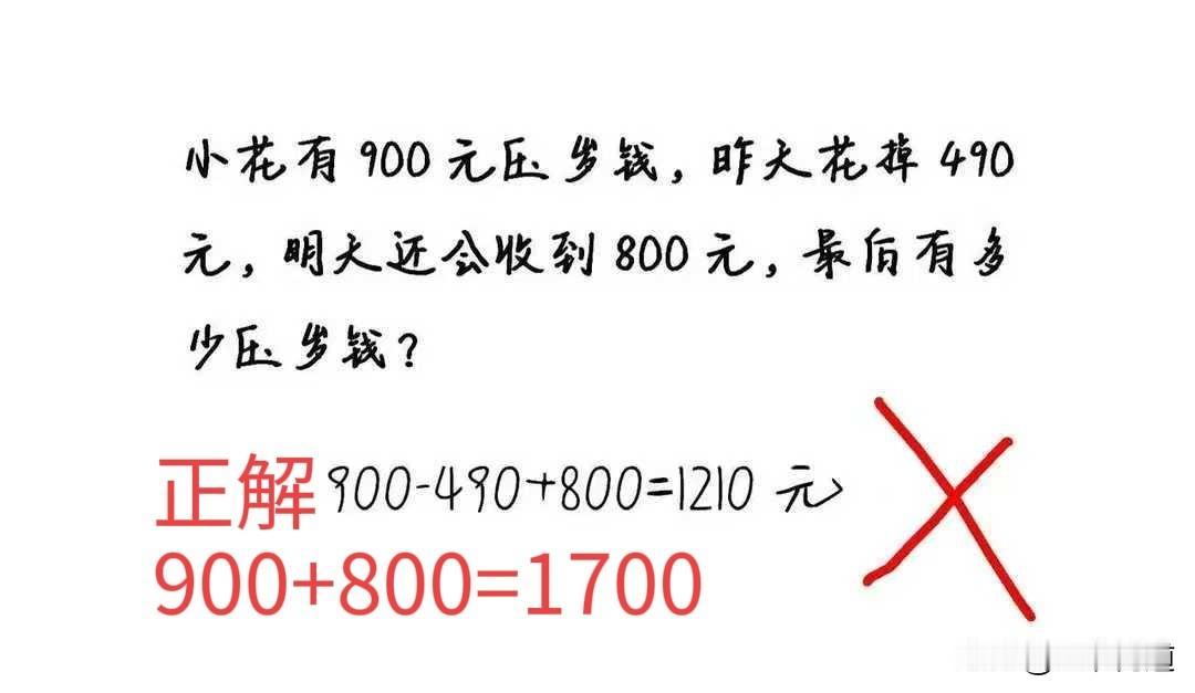题目:小明有900元红包,昨天花掉490元,明天还会收到800元,最后有多少压岁钱? 这种思维训练看似“坑人”,其实也是在考核文学素养,阅读理解能力,这道题的计算并不难,重点在于读懂题目,读懂题目需要细心,知道核心,排除干扰项。 回归题目是问压岁钱有多少钱,那么花掉的钱和有多少压岁钱也无关,因为不是问压岁钱剩下多少,即使全部花完,那和有多少压岁钱无关,所以最终答案是900+800=1700元。花掉490元这个就是无关干扰项!