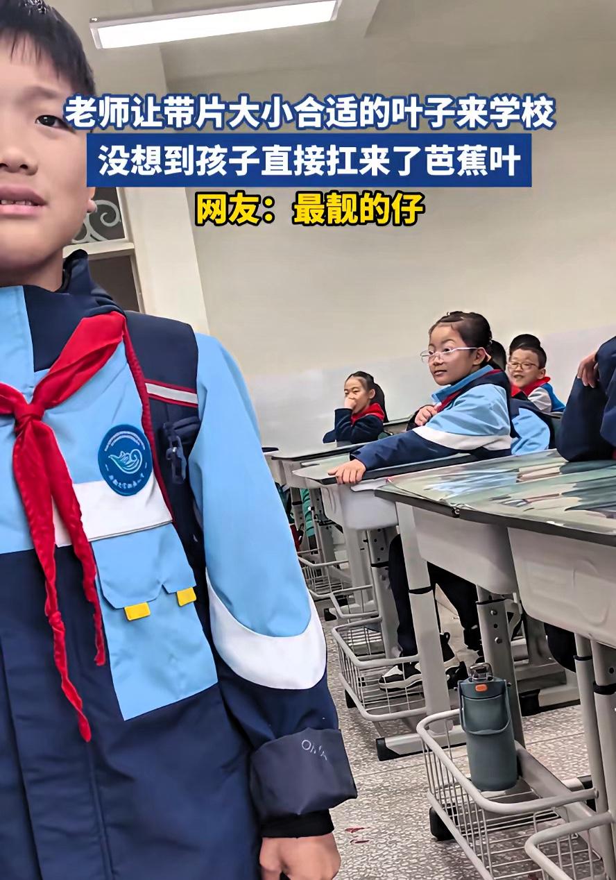四川,一老师给同学安排任务,让他们自己找片叶子上课用,可没想到,一个小男孩竟然直接扛了一片“芭蕉叶”过来,把老师都看呆了。网友:“他妈妈是铁扇公主吗?” 早上同学们都乖乖坐在座位上,手里攥着小巧的枫叶、银杏叶,还有的带了嫩嫩的三叶草,个个都符合“一片叶子”的要求。 就在大家等着老师开始活动时,教室后门突然传来“咚咚”的声响,紧接着一个小小的身影晃悠悠挤了进来。 仔细一看,这小男孩双手死死抱住一片比他还高的芭蕉叶,叶边都快拖到地上了,上面还挂着晶莹的露水,一看就是早上刚从树上摘下来的新鲜货。 他费劲地把芭蕉叶扛到自己座位旁,叶子太大差点蹭到旁边同学的桌子,小脸憋得通红,却一脸认真,仿佛扛着什么稀世珍宝。 老师看到这一幕直接愣住了,半天没反应过来,笑着问他:“你这是带了片‘芭蕉扇’来?老师让带一片叶子,你怎么带了这么大一片?” 小男孩有点腼腆地低下头,小声回了句:“老师说要带大小合适的,我觉得这片刚好呀。” 这话一出口,全班同学瞬间笑作一团,连老师都忍不住笑弯了腰,赶紧帮他把芭蕉叶靠在墙角,生怕不小心给弄坏了。 后来才知道,这叶子是小男孩和爸爸一起找的,爸爸觉得叶子大实用,小男孩也觉得像西游记里的芭蕉扇,越看越喜欢,就兴冲冲扛来了。 网友们的评论更是笑不活了,有人说“这是把火焰山的装备搬来了吧”,还有人调侃“爸爸怕不是牛魔王转世”。 成年人总爱用“默认规则”去理解事情,觉得叶子就该是小巧的,可在孩子眼里,“一片叶子”就是字面意思,喜欢、觉得合适就够了。 这种不被世俗标准束缚的认真劲儿,可比千篇一律的“标准答案”可爱多了,也难怪大家越看越喜欢。