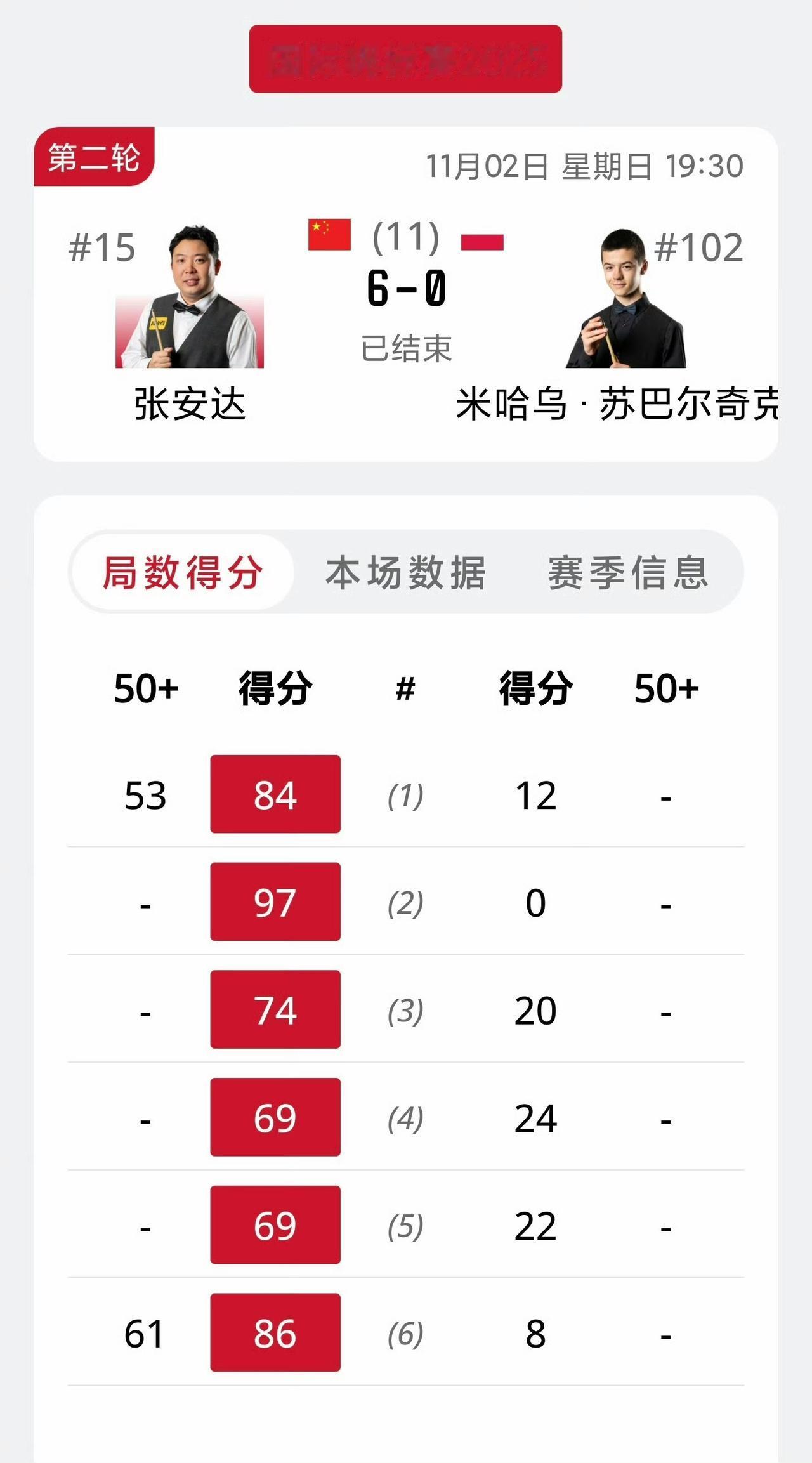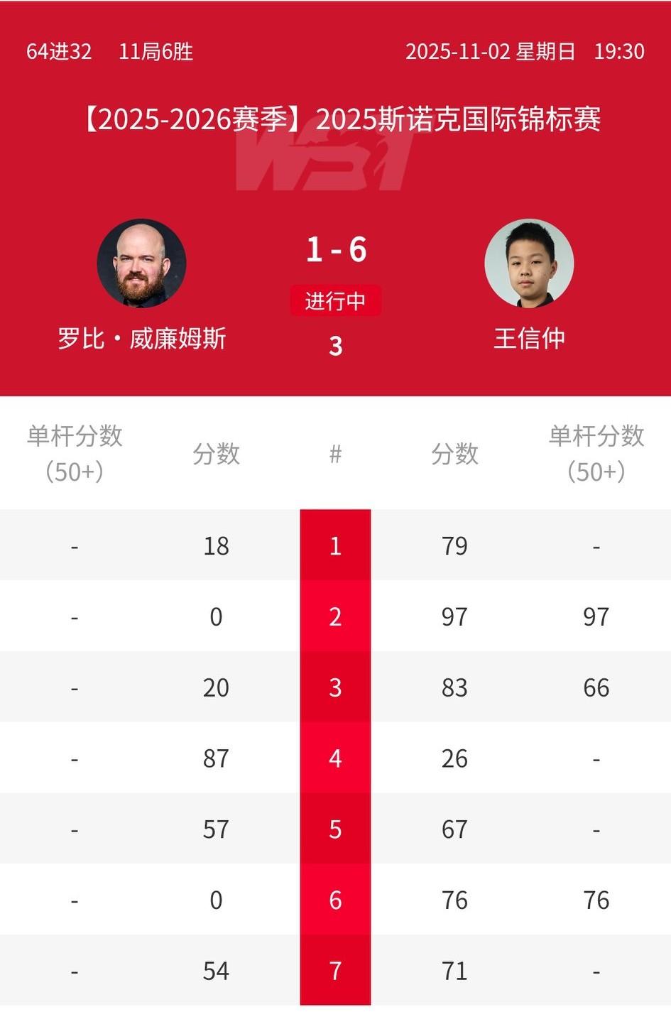 2025斯诺克国锦赛64进32轮次,继下午时段3名中国球员晋级,晚上时段又有4名中国球员晋级。 王信仲一日双赛,上午6-4击败白雨露,晚上6-1击败罗比威廉姆斯晋级32强。 吴宜泽6-1吕昊天 张安达6-0米哈乌(晋级后,达仔继续保留争夺世界前16希望) 斯佳辉6-1王雨晨