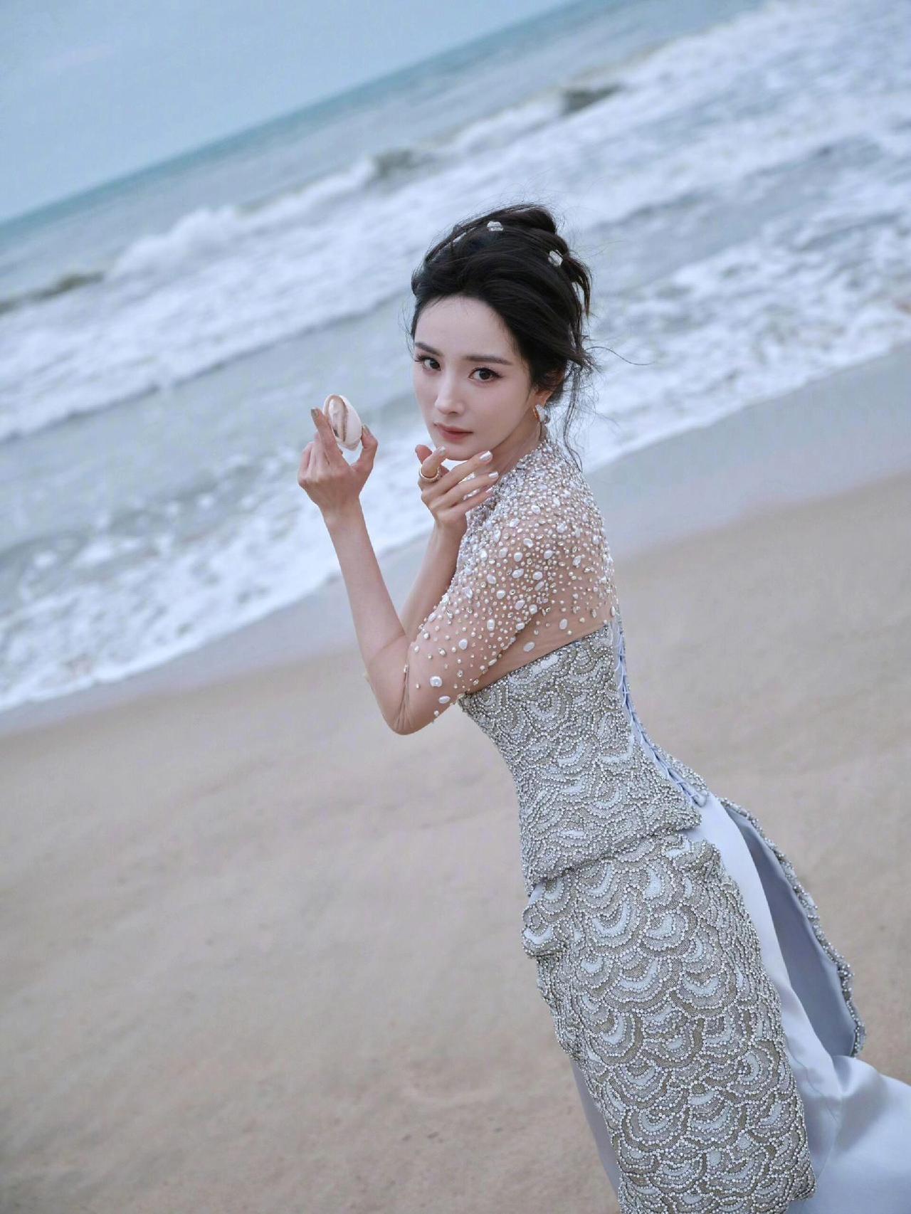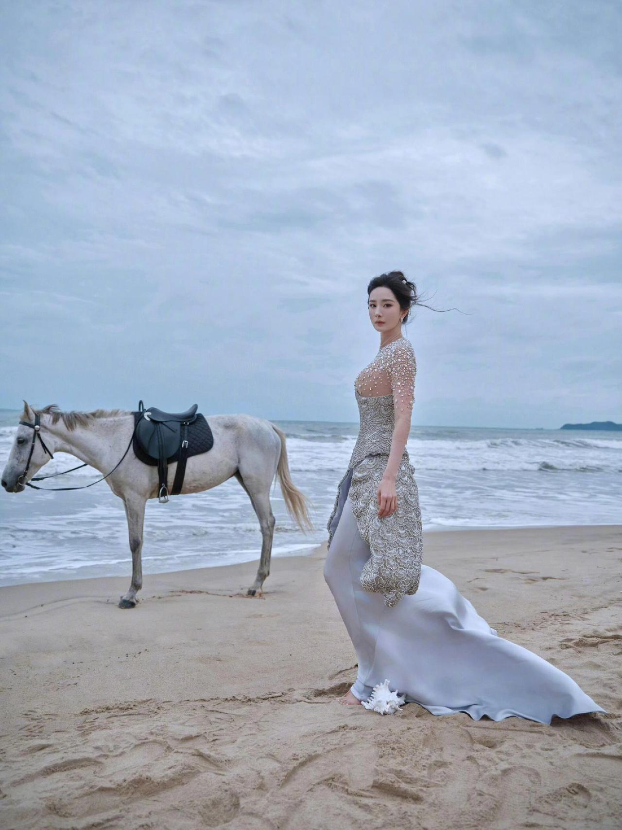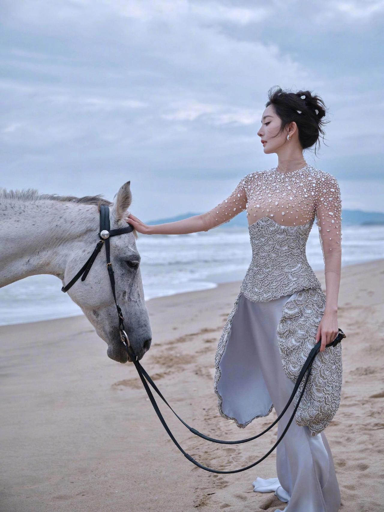 杨幂这身Miss Sohee 2025高定礼服太戳“人鱼神女感”了!珍珠+碎钻铺满的透视纱袖+层叠鳞片裙,像把海浪的光泽焊在身上;搭配Pomellato珠宝和CL紫高跟鞋,海边牵马的画面直接把“优雅贵气”和“空灵氛围感”拉满,是真·人鱼公主上岸既视感~杨幂 幂式穿搭
