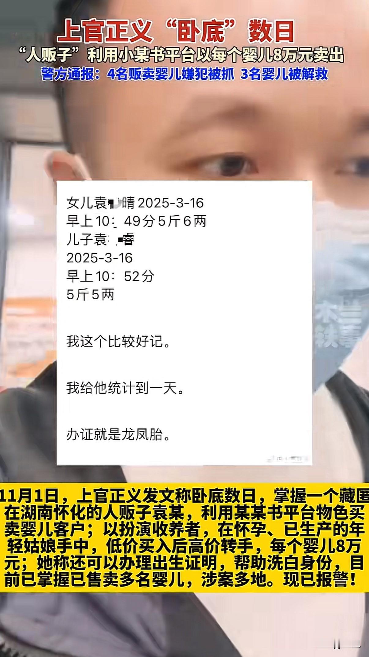 绝了!打拐志愿者举报贩婴,反手被警方扣留3小时,手机还被强制收缴!这操作谁看懂了? 据报道,11月1日,打拐志愿者上官正义卧底发现湖南怀化有人贩子袁某,在小红书上物色客户,低价买婴儿再以8万元高价卖出,还能办假出生证明洗白身份。他报警后,现场解救了一名婴儿,抓了两名嫌疑人。 结果呢?怀化市城南派出所所长说他“违法”,把他两部手机抢了,安排人看着他,整整3个小时,上厕所都不让。直到晚上快6点才还手机。 后来警方通报,说举报属实,已经解救3名婴儿,抓获4名嫌疑人。那问题来了,既然举报是真的,为啥要这么对待举报人? 上官正义不是第一次打拐了,之前帮警方破了不少网络贩婴、伪造出生证明的案子。这次他冒着风险卧底,换来的是被警方当嫌疑人一样看管? 咱们换位思考一下,要是以后没人敢当志愿者举报犯罪了,那得有多少坏人逍遥法外?警方打击犯罪是对的,但对待举报人是不是也得讲点方式方法? 现在上官正义要求湖南方面追责,这事儿确实得好好查查,给举报人一个公道,也给社会一个交代。 你们怎么看这事儿?评论区说说你的想法。