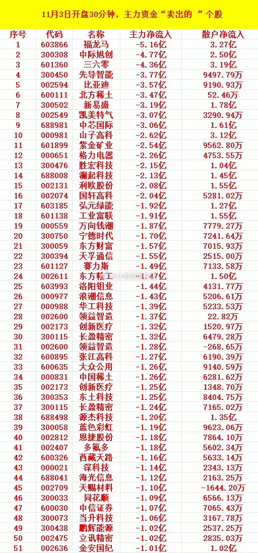 11月3日开盘30分钟资金博弈全景:主力撤离51只个股,散户承接分化显著