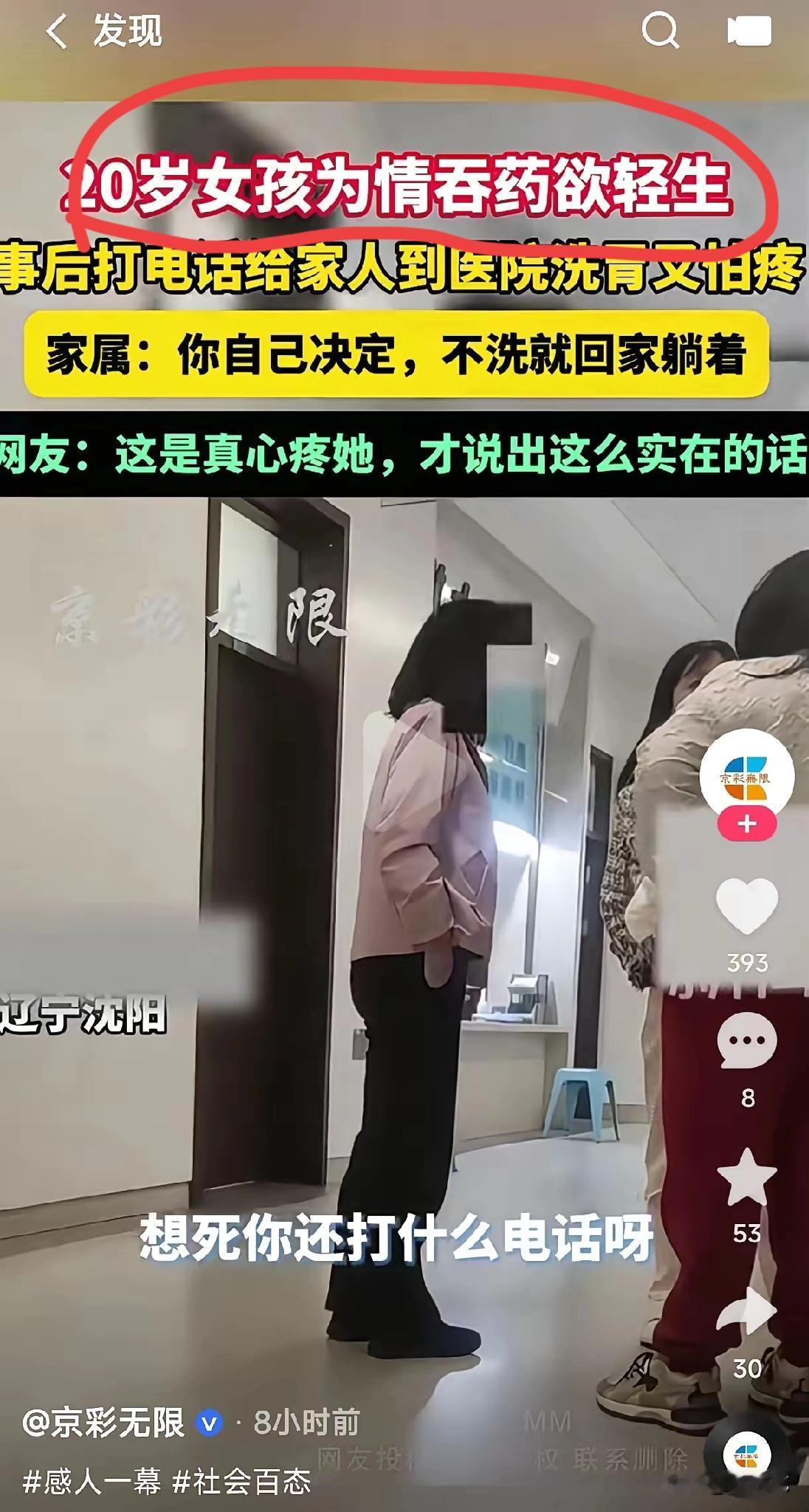 20岁女生为情吞药威胁家人,洗胃怕疼还想两全?父母一句话怼醒所有人! 为了感情就拿生命当筹码,吞药后又怕疼想反悔,打电话给家人求助却不愿洗胃,这哪是真的想死,分明是仗着家人的爱肆意撒娇威胁。 父母那句“不洗就回家躺着等死”,听着狠其实是无奈之举。 好话劝不醒的犟孩子,就得让她直面自己选择的后果,不然永远不知道生命的珍贵,也不懂家人的牵挂。 人教人教不会,事教人记终生。 有些道理,不是父母唠叨就能懂的,非得自己撞了南墙,才明白那些“狠话”背后全是爱。 懂事的孩子从不会拿生命开玩笑,唯有让她为自己的任性买单,才能真正长大。