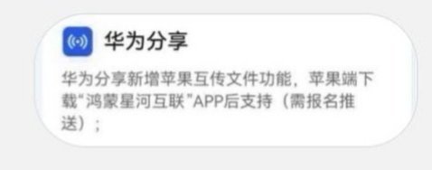 魅小权 发现,华为分享功能迎来更新,新增与苹果 iOS、iPadOS、macOS 平台之间的文件互传功能(苹果端需下载“鸿蒙星河互联”App)。