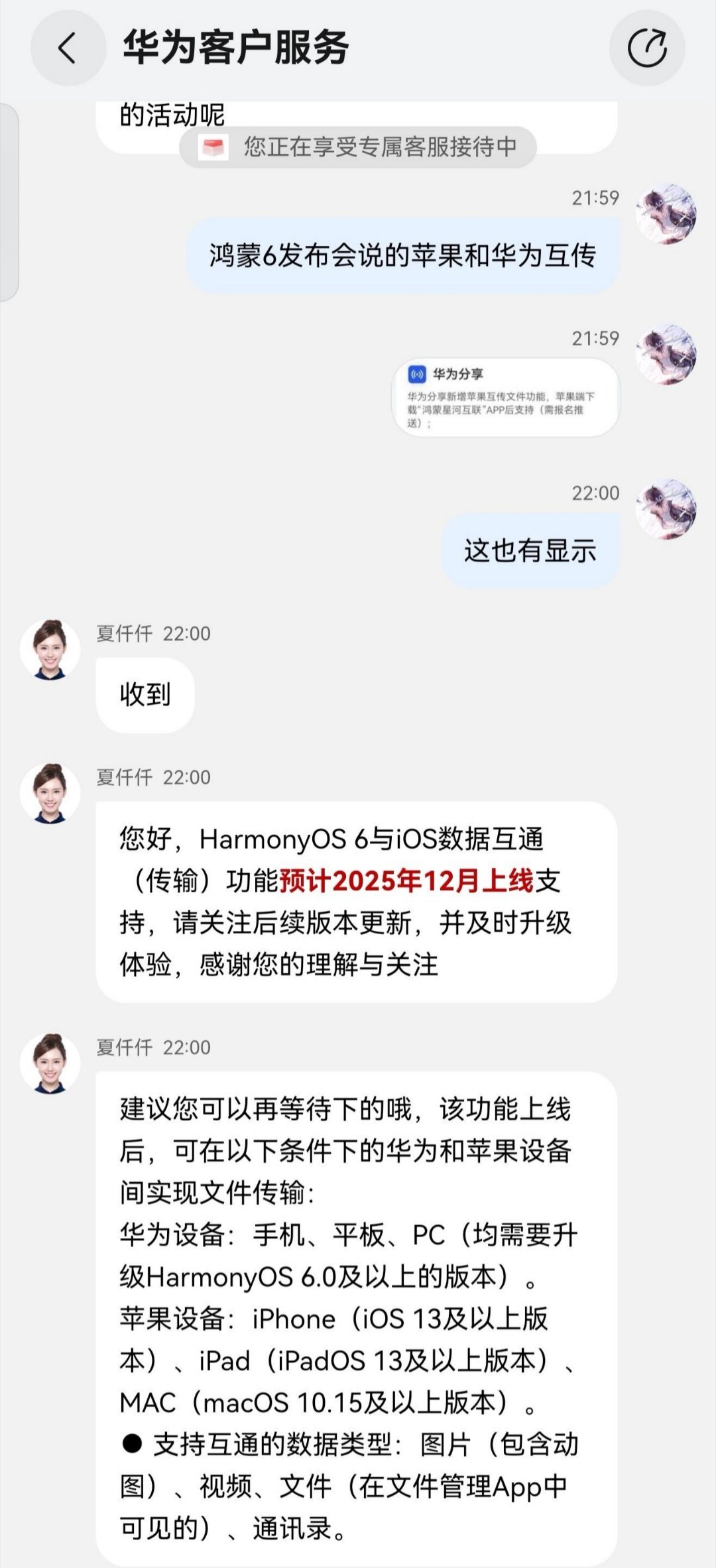 根据华为官方客服的解释,HarmonyOS 6 与 iOS 数据互通(传输)功能预计 2025 年 12 月正式上线支持。待该功能上线后,鸿蒙星河互联 App 可在以下条件下的华为和苹果设备间实现文件传输: