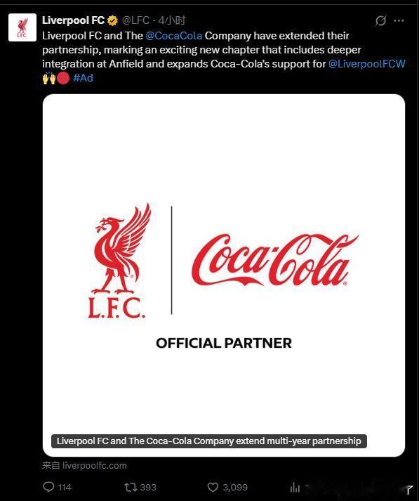 利物浦足球俱乐部与可口可乐公司已续签合作协议。