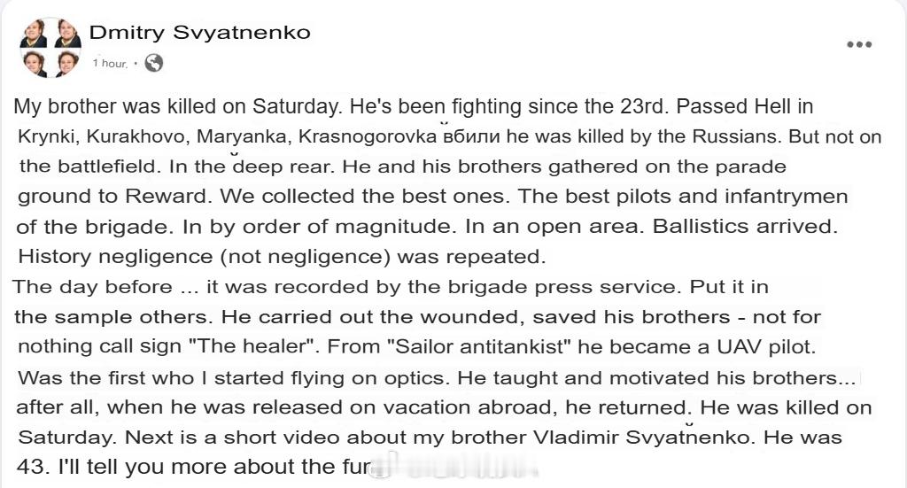 他周六牺牲了,年仅 43 岁。接下来是一段关于我兄弟弗拉基米尔・斯维亚滕科的短视频。关于葬礼的细节,我之后再细说。