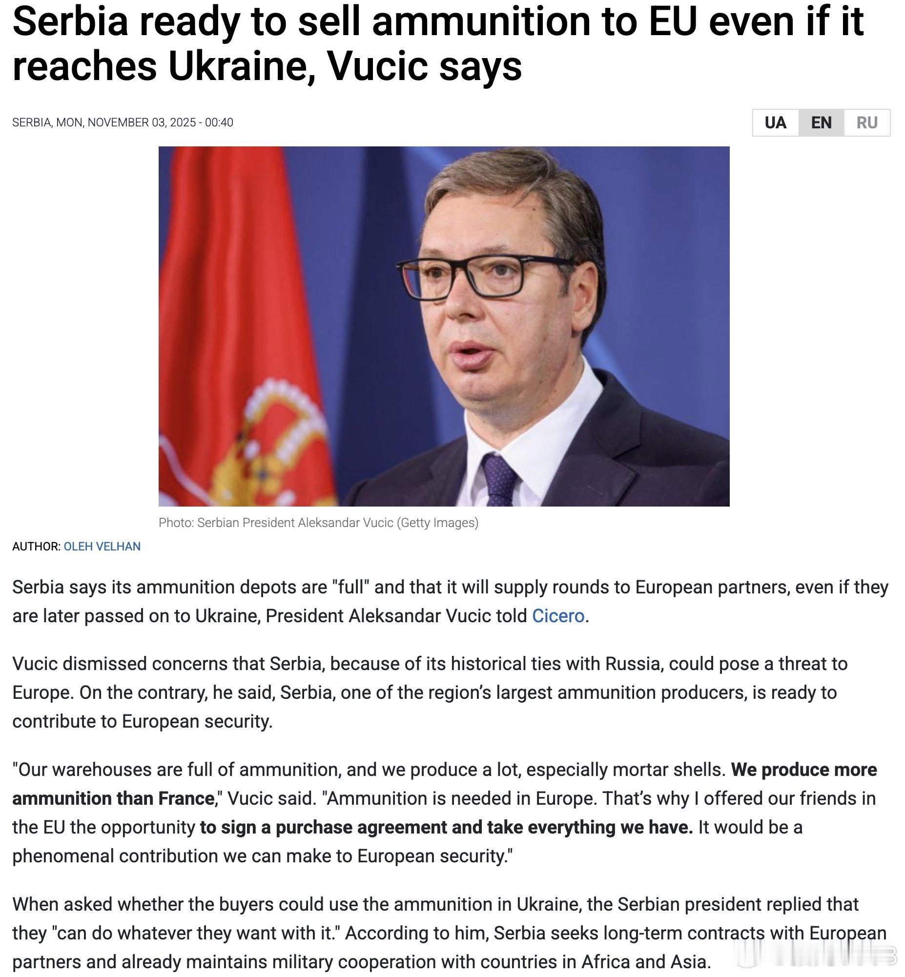 塞尔维亚现在公开表示,他们将向欧盟国家出售弹药用于乌克兰战争,并且他们的弹药产量比法国还多,他们愿意全部出售。