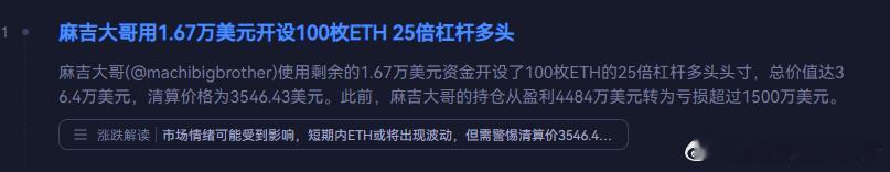 麻吉大哥用1.67万美元资金开100枚以太的25倍多单,清算价格3546.43。