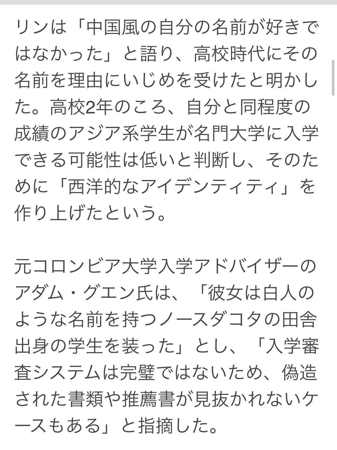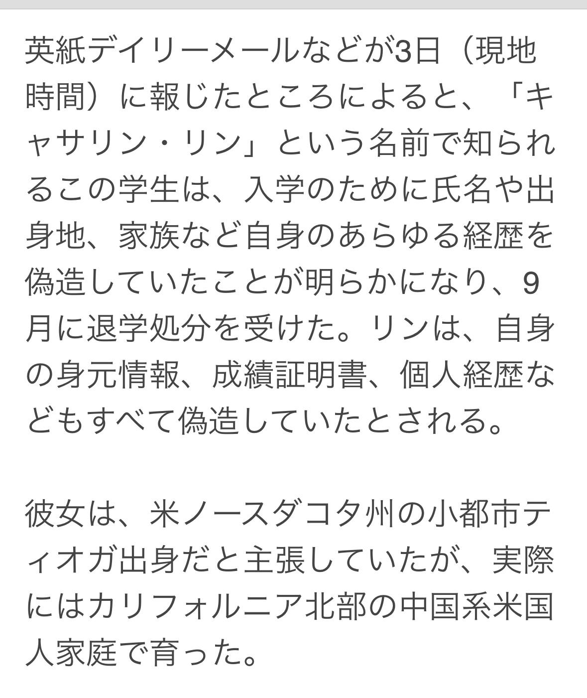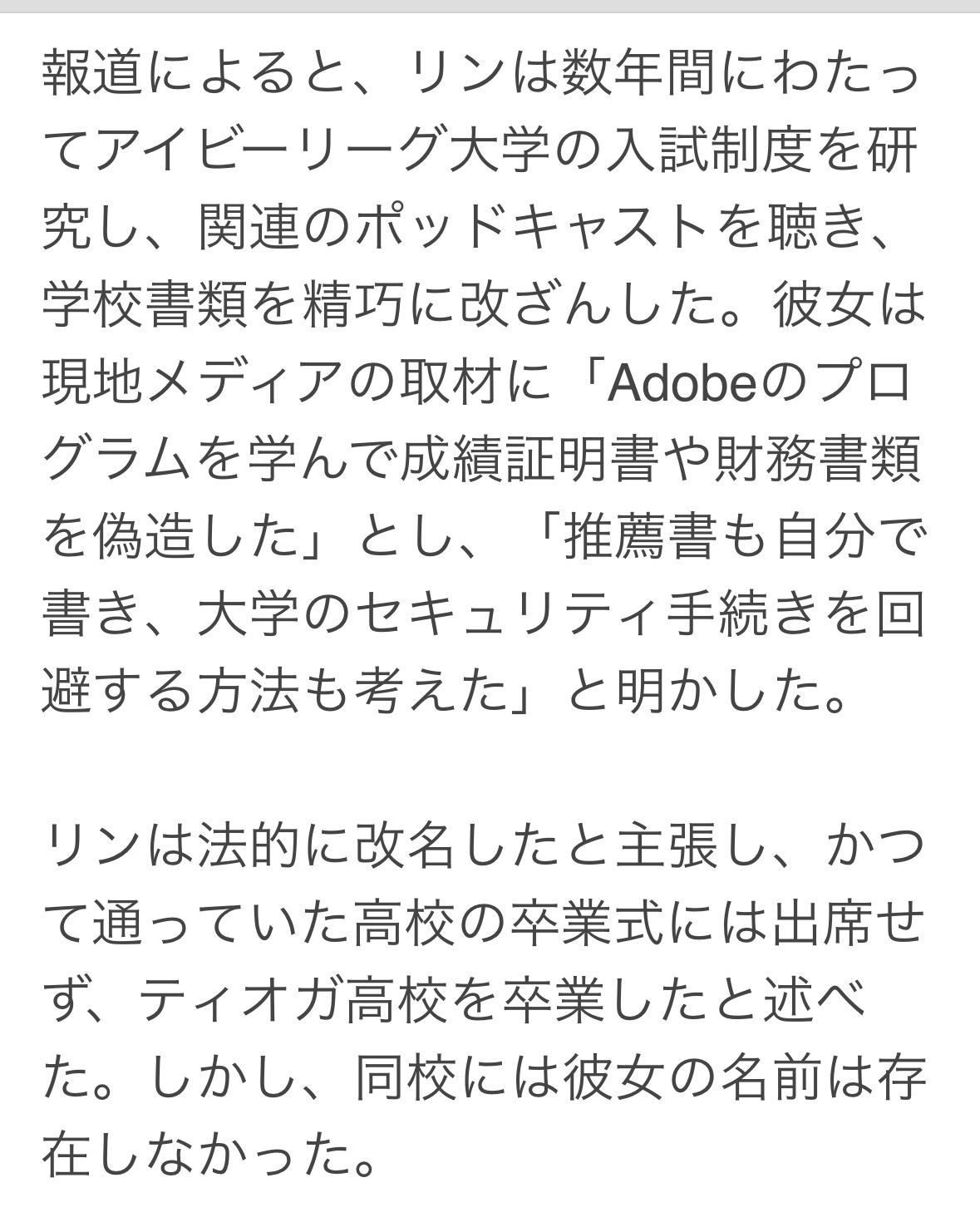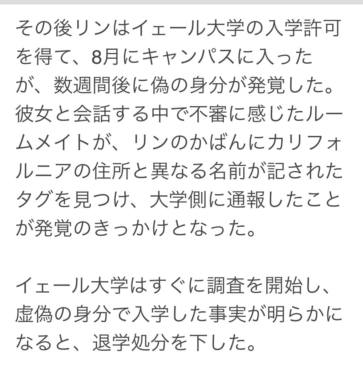 耶鲁大学9月开除了一位名为"凯瑟琳·林”的学生,校方发现她为了入学,伪造了所有身份信息、成绩单和个人经历。 她声称自己来自北达科他州的一个小城市蒂奥加,实际上她成长于加利福尼亚州北部的一个华裔家庭。 林一直不喜欢自己听起来像中文的名字,因为这个高中时遭到霸凌。高二时,她认为成绩与自己相当的亚裔学生不太可能被名牌大学录取,于是她伪造了一个西方身份。 林某花了数年时间研究常春藤盟校的招生系统,收听相关播客。学习Adobe软件来伪造成绩单和文件,撰写了自己的推荐信,并设计了绕过大学安全程序的方法。 林某8月抵达校园,几周后室友发现她书包上的标签、加州地址姓名不同,于是向学校报告了此事。