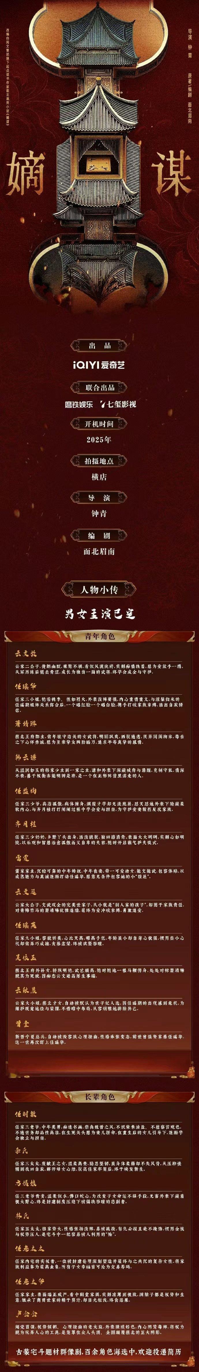 爱奇艺官方公众号发布了《嫡谋》组讯,12月开机,周期120天,网传阵容:何与、包上恩、男二候选赵一博、翟子路,夏之光,徐振轩、田栩宁。