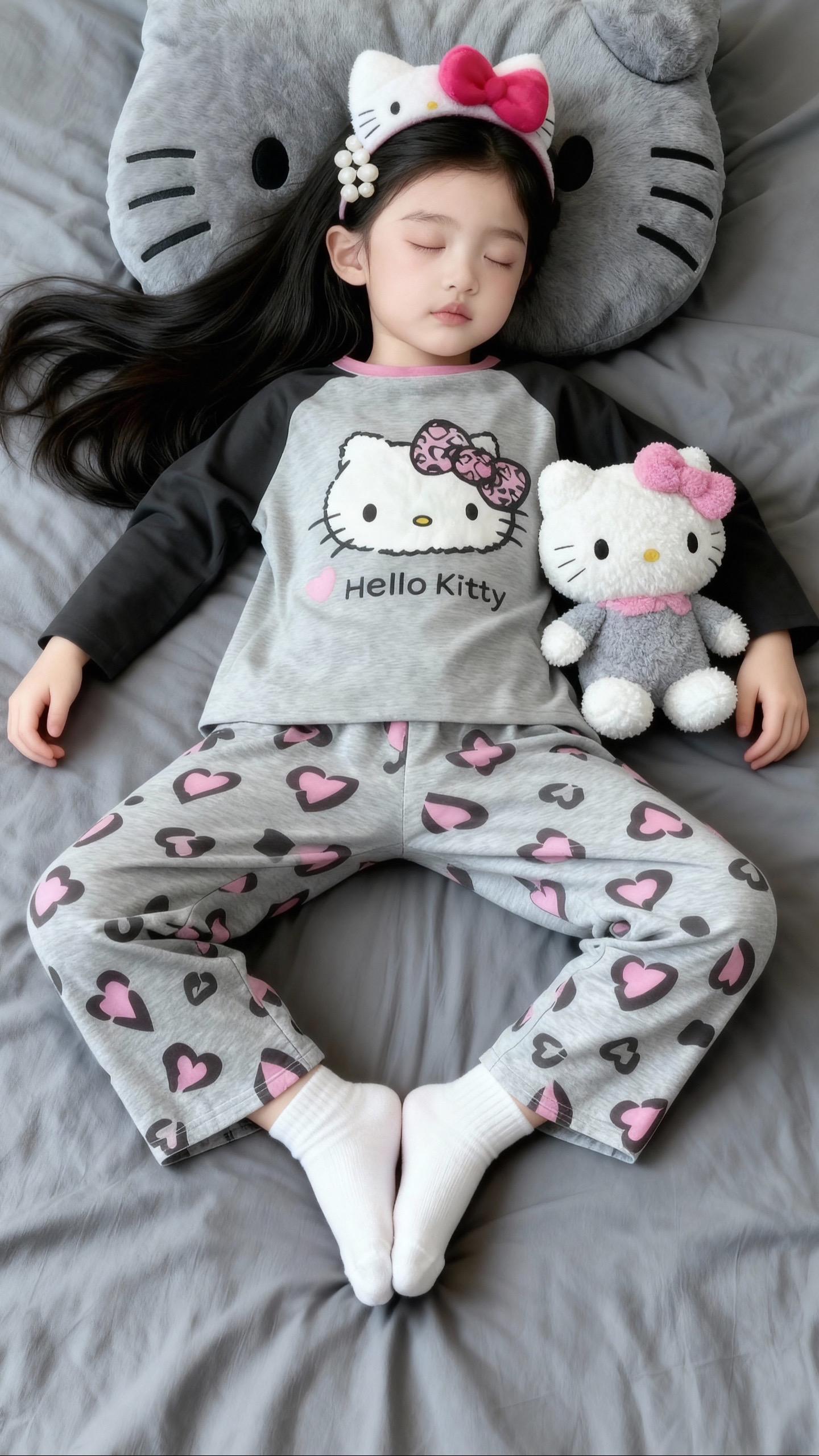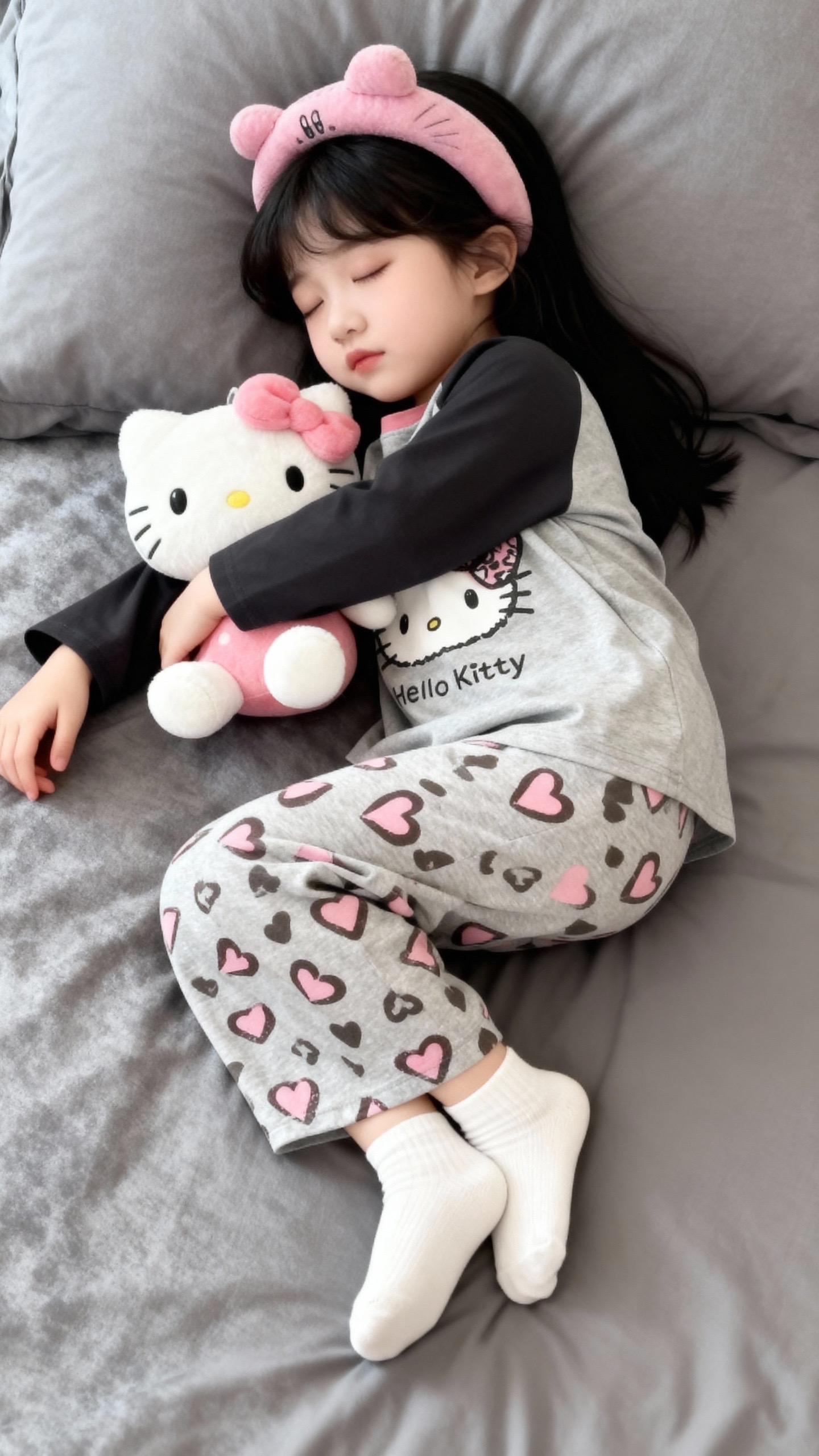 看着闺女抱着Hello Kitty玩偶。女儿穿着Hello Kitty睡衣睡着的样子,心都要化了,穿着这套满是爱心的睡衣安睡的模样,当妈的心都软成一团啦~睡衣软软糯糯的,Kitty头像和粉粉的爱心特别戳少女心,她枕着 Kitty 抱枕,小脚丫乖乖并在一起,像个小天使。每天盼着她能穿着喜欢的睡衣,甜甜进入梦乡,这画面真的把我治愈到了~