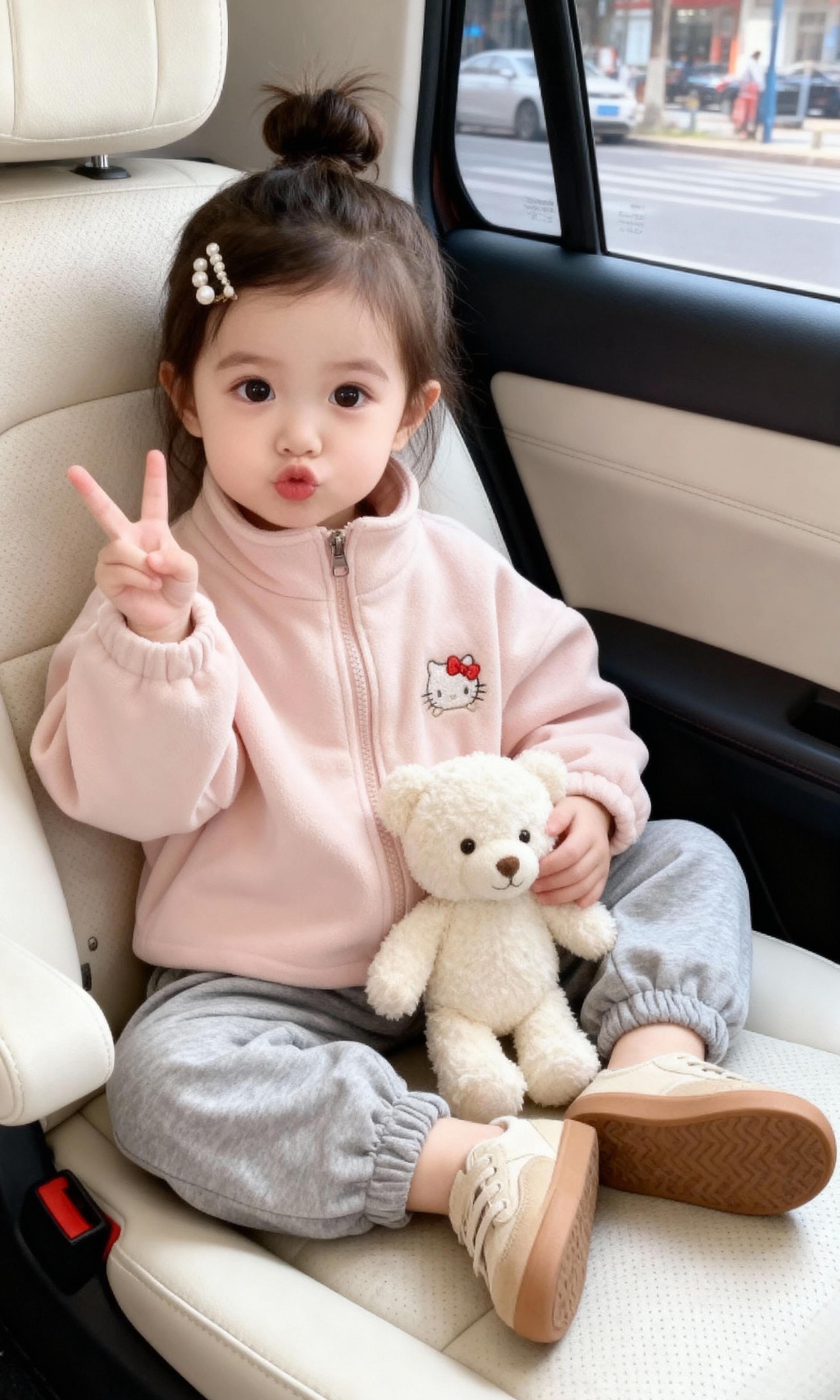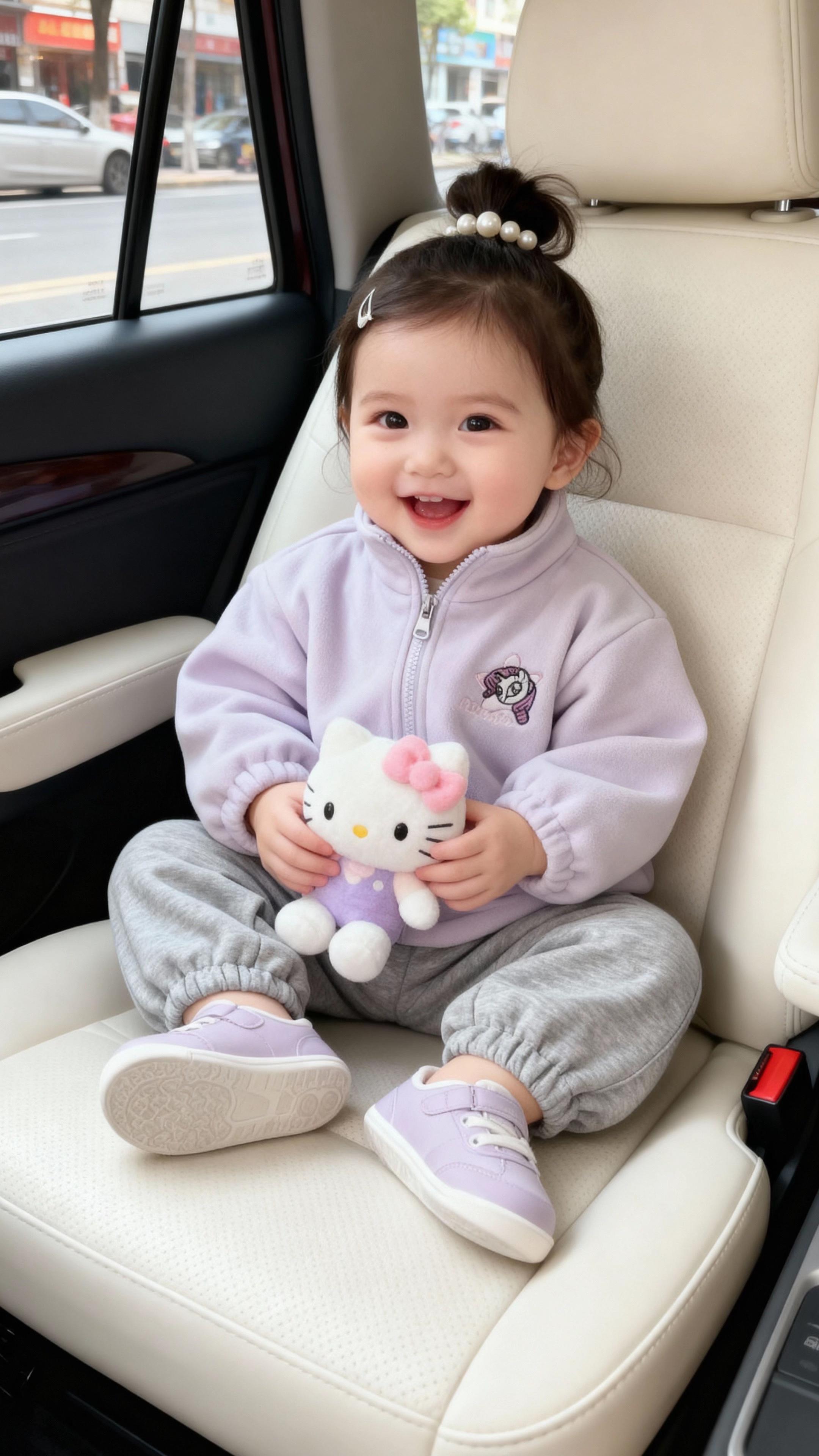 看着闺女抱着Hello Kitty玩偶。女儿穿着Hello Kitty...