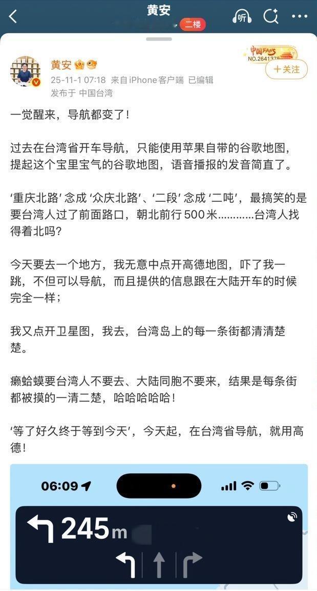 台湾能用高德导航了,官方阻止没用,百姓用脚投票实锤。 11月1日台湾歌手黄安发视频说在岛内能顺利打开高德地图,每条路都显示清楚。这说明大陆地图服务早已覆盖台湾,连偏远路线都比谷歌地图准。 台当局一直限制大陆App,但百姓更在乎好不好用。之前大陆打车、支付软件也被偷偷用,现在导航软件直接公开运行。大陆还同步推出探亲签证简化政策,往返两岸手续更快。 赖清德喊着防渗透,可百姓日常出行、办事越来越依赖大陆技术。技术和服务一旦好用,政治口号拦不住实际需求。现在台湾人每天用大陆App,改变的不只是生活,还有心里的想法。