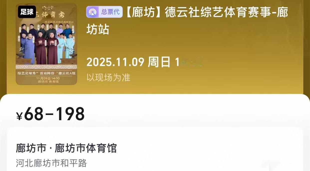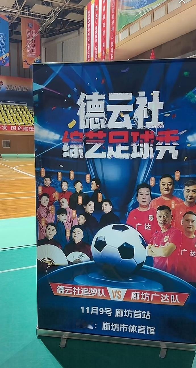 德云社演员不仅说相声,还跨界踢足球了!德云社追梦队将于11月9日,在廊坊市体育馆迎战廊坊广达队。从海报可以获悉,德云社追梦队的成员就是相声大会A组的成员,十二人,刚刚好。对于这场比赛,德云社追梦队也是非常重视的,已经在体育馆开始训练。这场比赛,大麦网是有门票售卖的。分五个档次,内场一个档次,198元。看台四个档次,68元、98元、128元、158元。由于能够在线选座,门票销售,整体还不错。