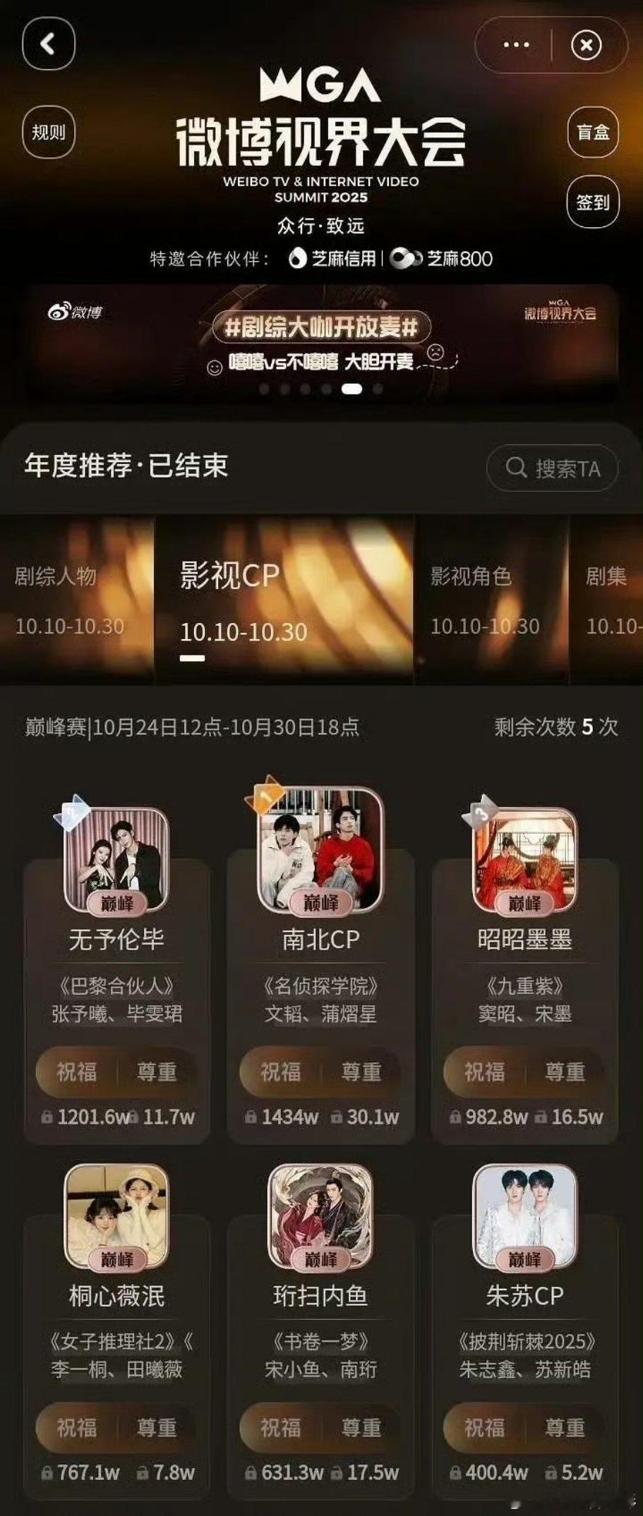这事闹的,小H和小O没有任何一票但就是当选了[doge]视界大会cp奖给了向往的