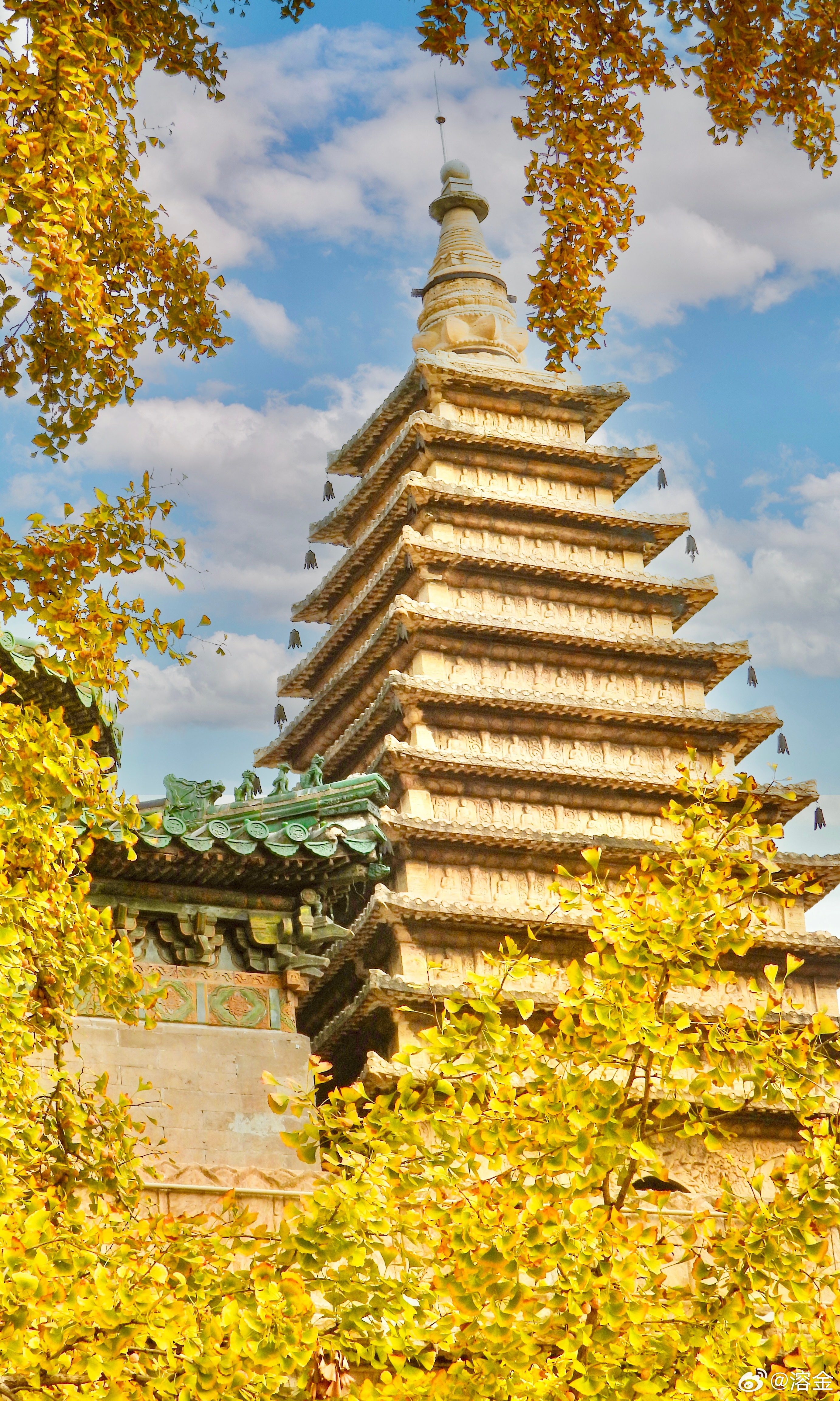 【五塔寺】古寺塔如笔,银杏画秋章。客来阶下立,仰见柿子黄。