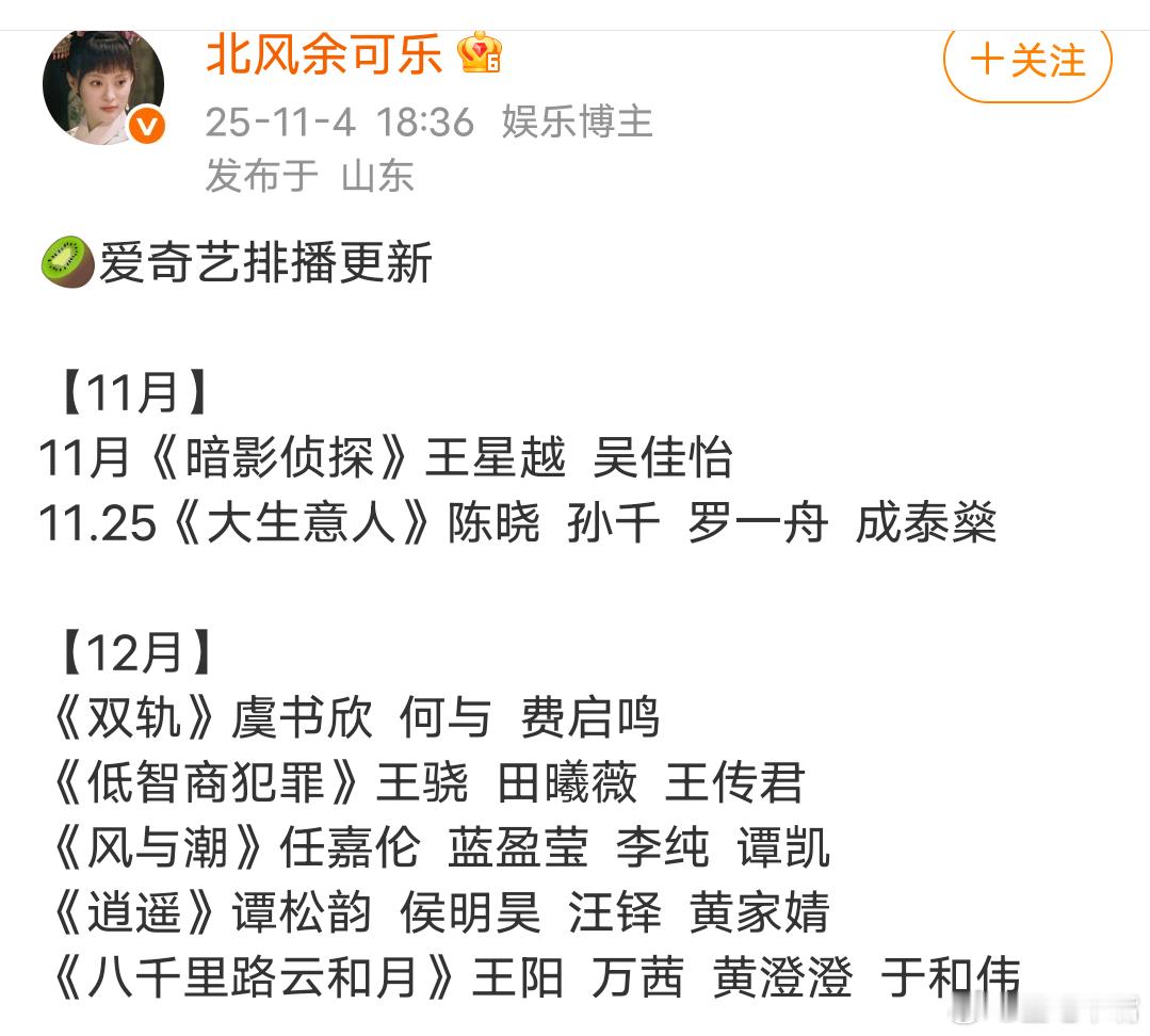 爱奇艺12月排播:划重点:《风与潮》《逍遥》,这两部都是央视片单剧集,不出意外的《风与潮》上央一!