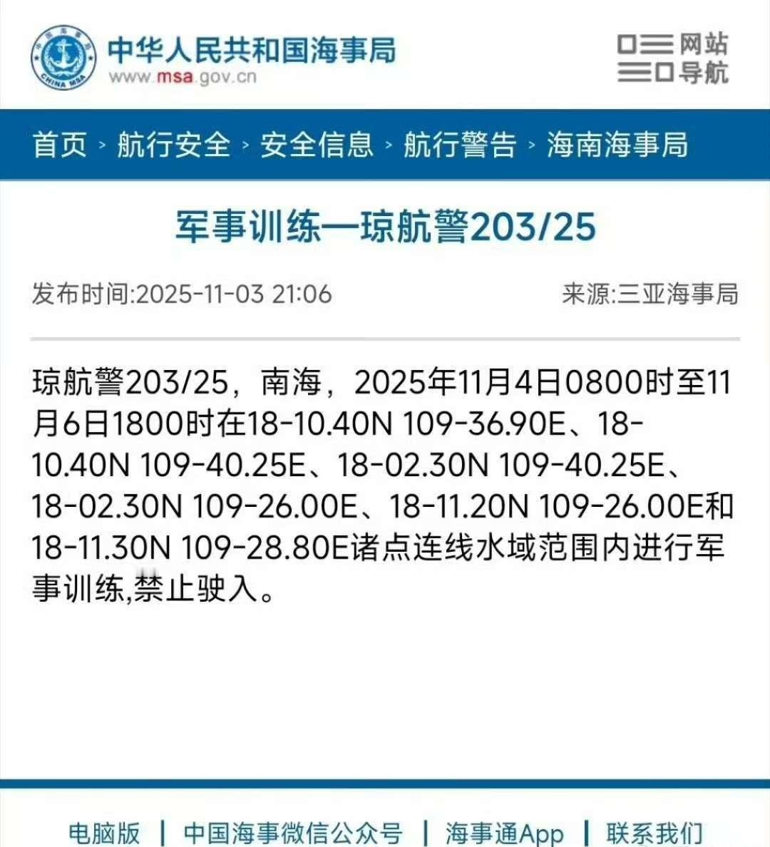 据中国海事局网站消息,三亚海事局发布航行警告,11月4日8时至6日18时,南海部
