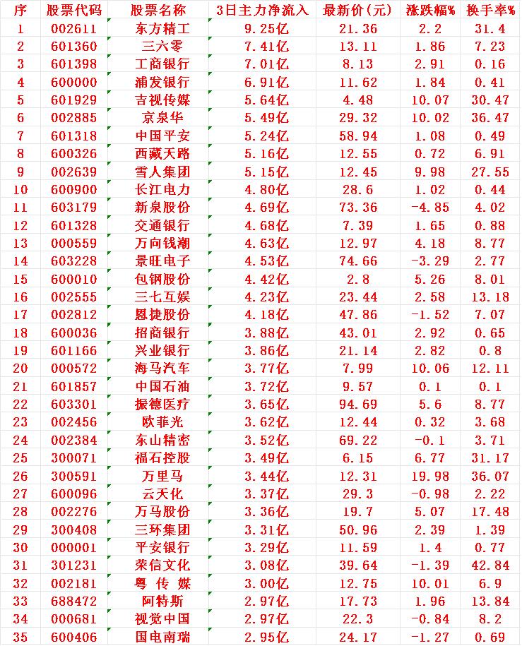 11月5日,前3天主力大幅买入的35名单! 东方精工:3日主力净流入9.25