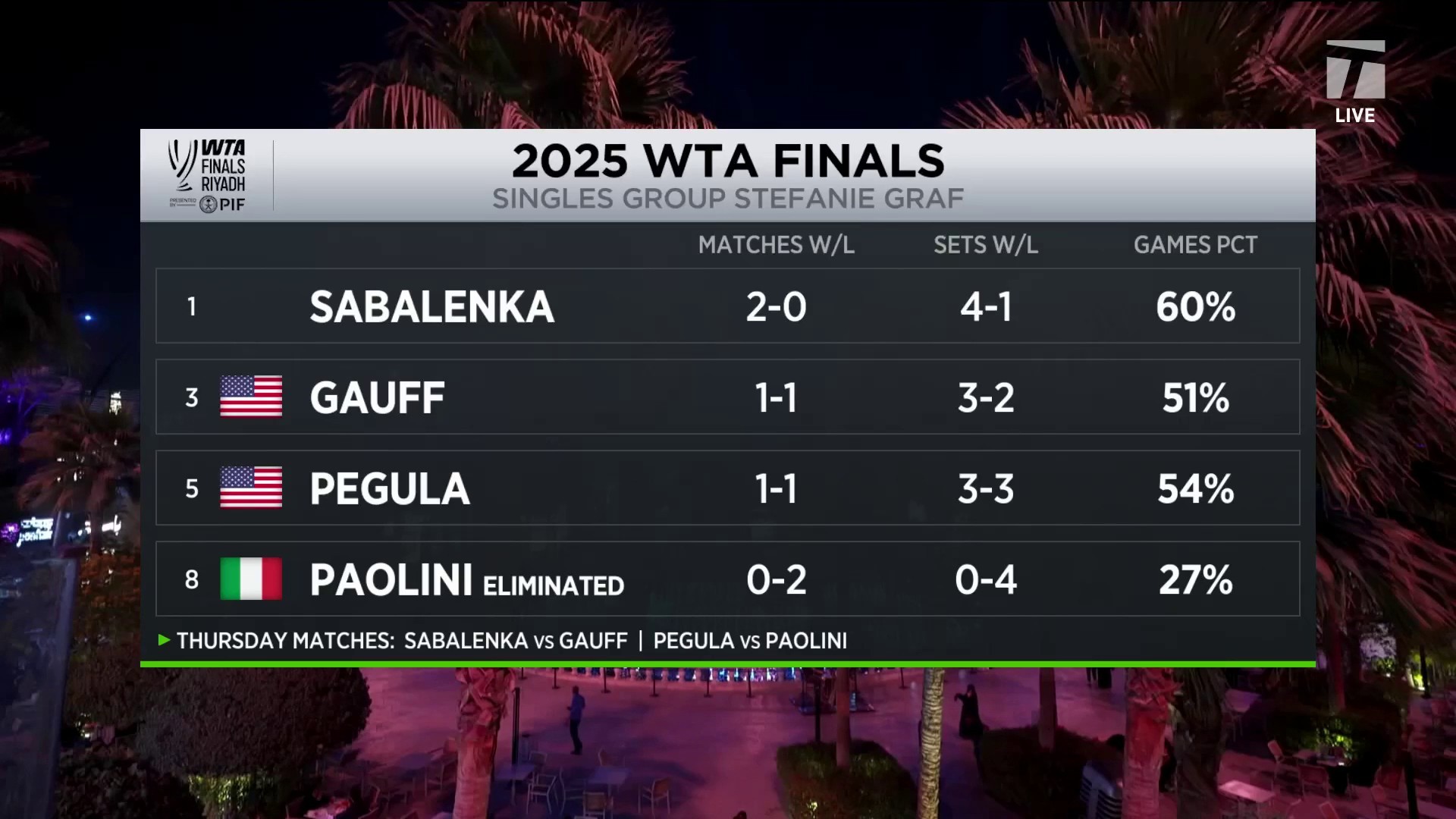 本着看热闹不嫌事儿大的原则,我现在求一个佩古拉2-0鲍里妮/高芙2-1萨巴伦卡的结果——萨巴伦卡、佩古拉、高芙,三人都是2胜1负,净胜盘5-3,形成完美连环套,需要通过计算净胜局决出出线名额。。。这剧本,刺步刺激,精不精彩[doge]