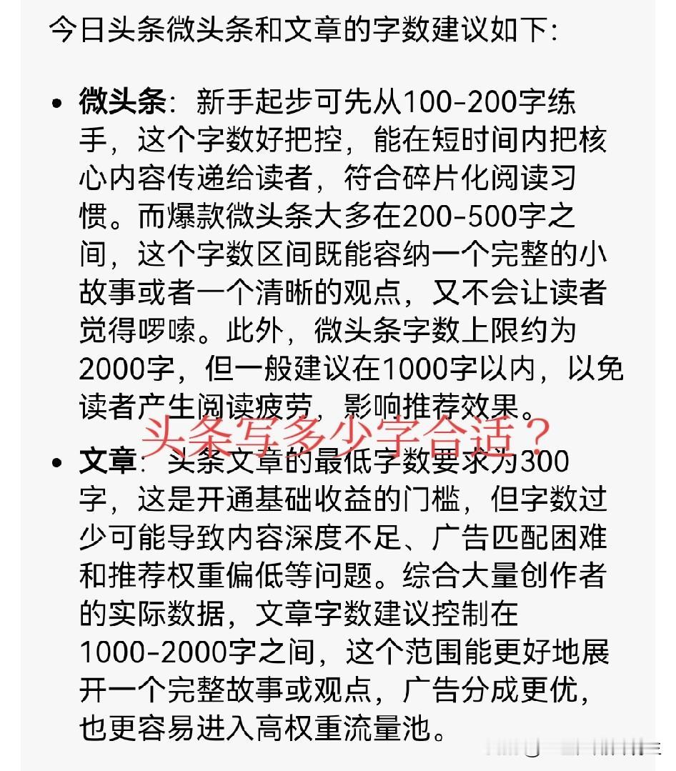 其实今日头条的收益给的还是很可观的,给的最多部分是文章,然后是微头条最后才是视频,那我们经常看到有很多小白写微头条写五六百字长篇大论,其实这是不建议的因为很少人能把你这个微头条看完太啰嗦了,微头条一定要注意他这个“微”字,字数控制在200字左右就可以了,如果你感觉这个头条流量给的足推荐量给的够那么你再把它转化为文章,很系统的去说这个事情,至于文章来说300字就有收益了不过太短不会给太多。建议800-1000字最好,事件说的明白又不过多啰嗦。