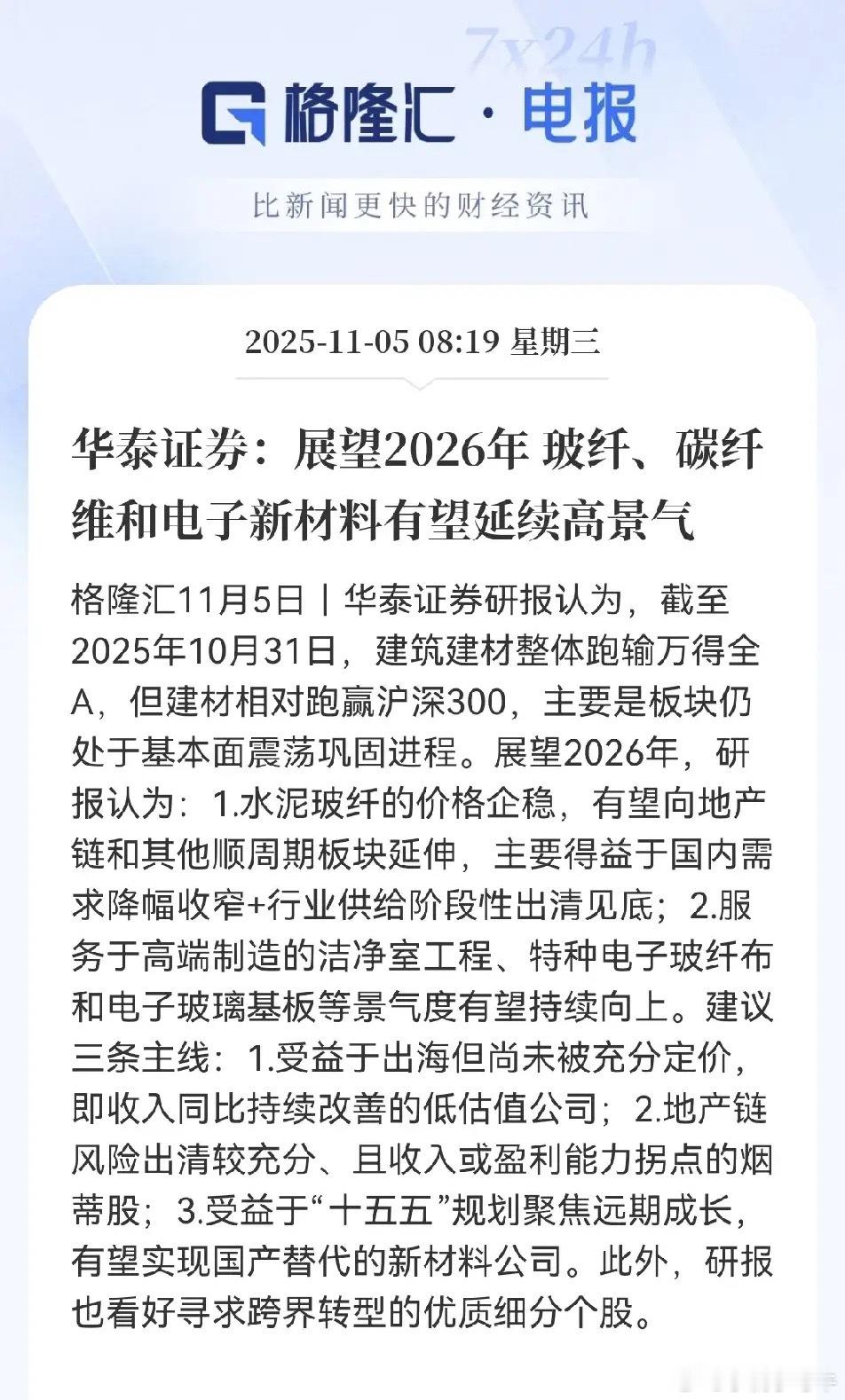 华泰证券这份展望挺提气的!虽然建材板块前阵子有点低迷,但报告明确指出,到2026年,玻纤、碳纤和电子新材料这几个方向,会继续保持火热!