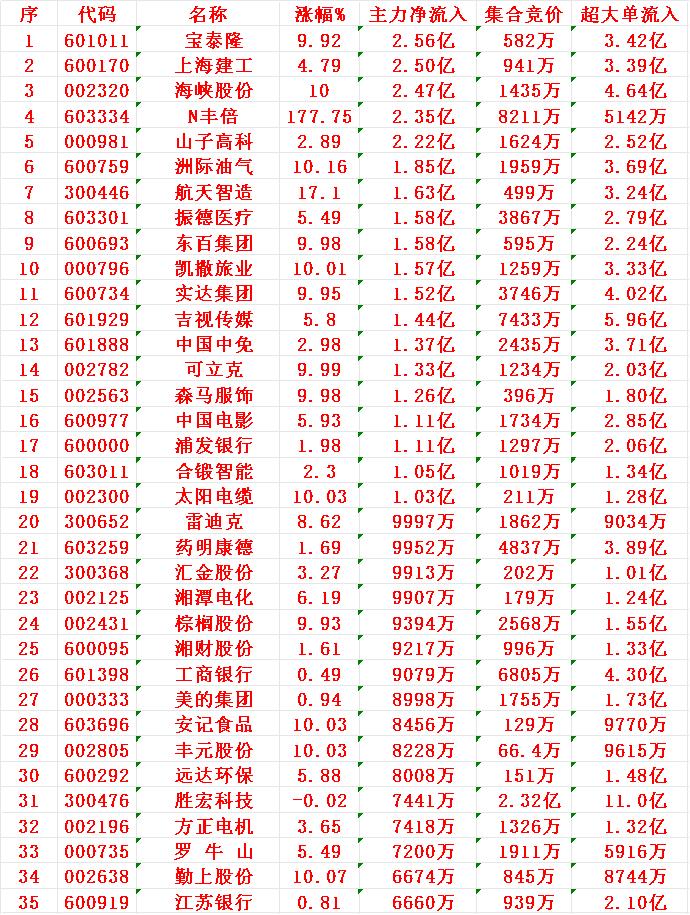 11月5日开盘45分钟,主力资金“买入的 ”的35名单一览! 宝泰隆:净流入 2.56亿元 上海建工:净流入 2.50亿元 海峡股份:净流入 2.47亿元 N丰倍:净流入 2.35亿元 山子高科:净流入 2.22亿元
