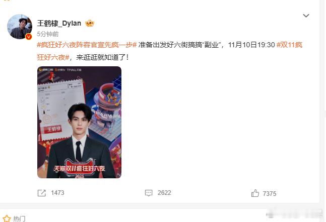 王鹤棣准备搞搞副业 听说王鹤棣要在好六街搞副业,帅气外形搭配热情态度,妥妥的 “副业门面担当”,太吸睛了。