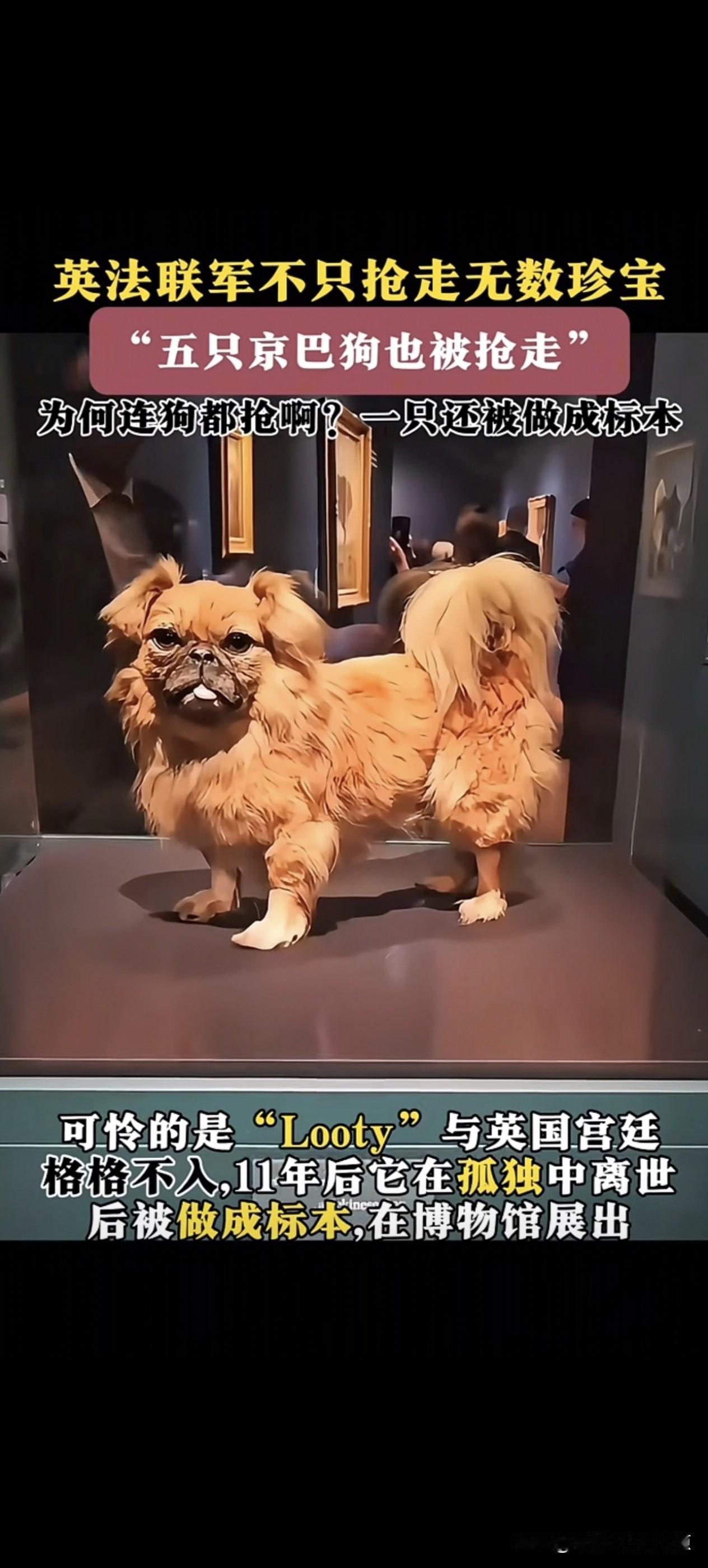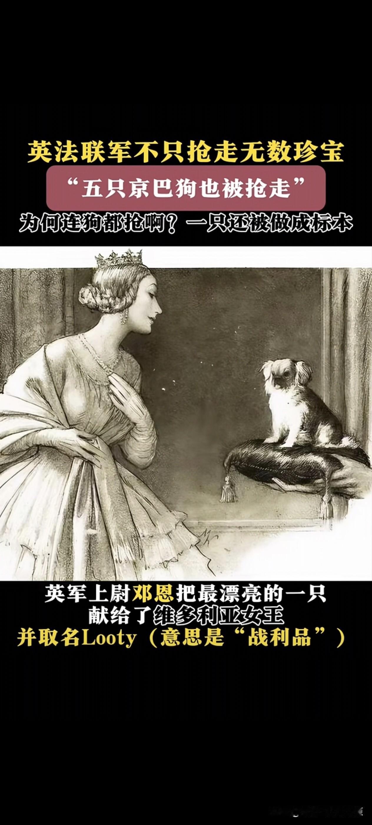 连宠物狗都抢?1860年第二次鸦片战争爆发,7000多的英法联军加上1万多的印度大头兵,2万余人打进了圆明园。 但你以为他们掠夺的走的仅仅只有文物和金银财宝吗? 不,据史料记载,他们连狗都抢,我说的不是12生肖兽首,而是一只京巴犬。 其中一只还被命名为looty(战利品)。