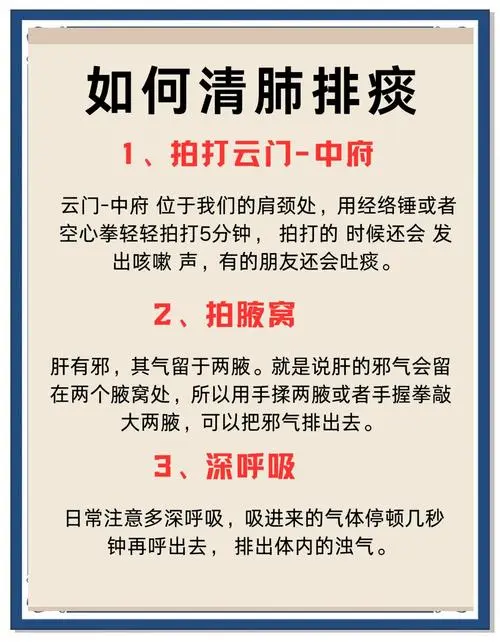 如何健脾胃: 1.睡前拍腹 2.少吃生冷食物 3.吃养脾胃食物 如何清肺排痰: 1.拍打云中-中府 2.拍腋窝 3.深呼吸