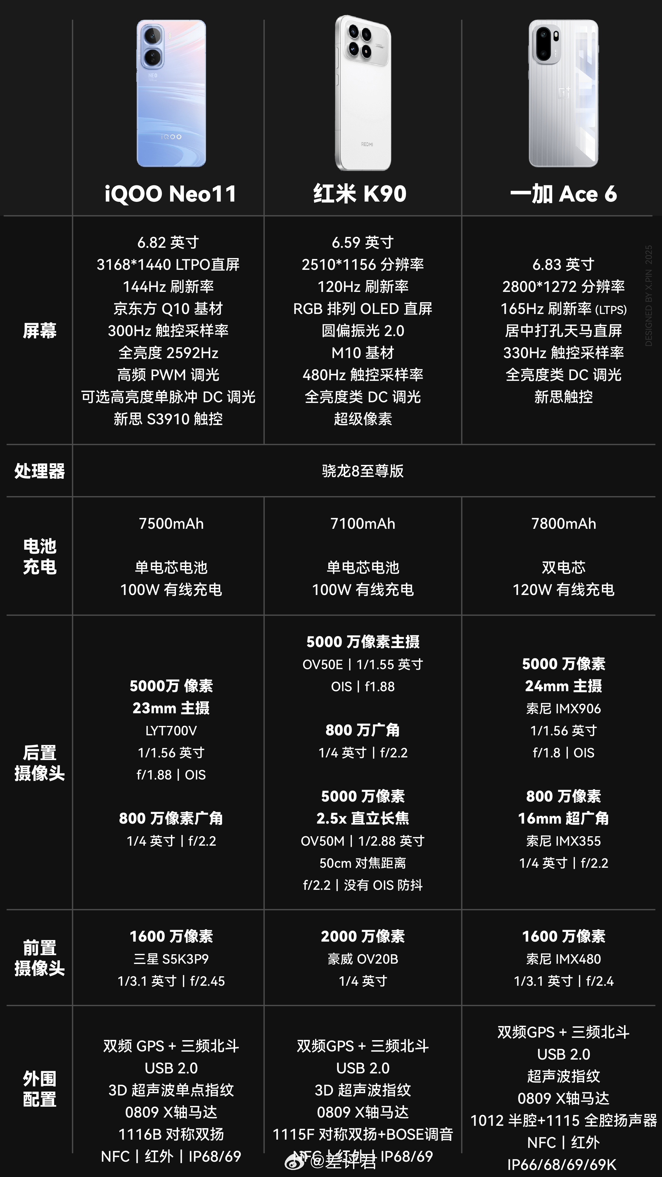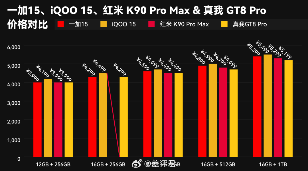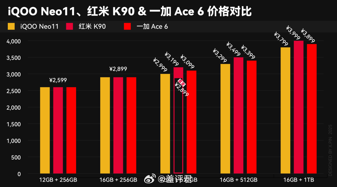 【红米K90】 12GB+512GB,大家请认准这个版本,其他型号一概不推荐哈。但凡没有2899这个好价,我都不推荐大家去入手。如果是在价格一样的情况下,我的建议是喜欢玩游戏的差友可以考虑一加Ace 6和iQOO Neo11。对于想要日常体验更全面、拍照更好的差友来说,可以考虑下红米K90 。
