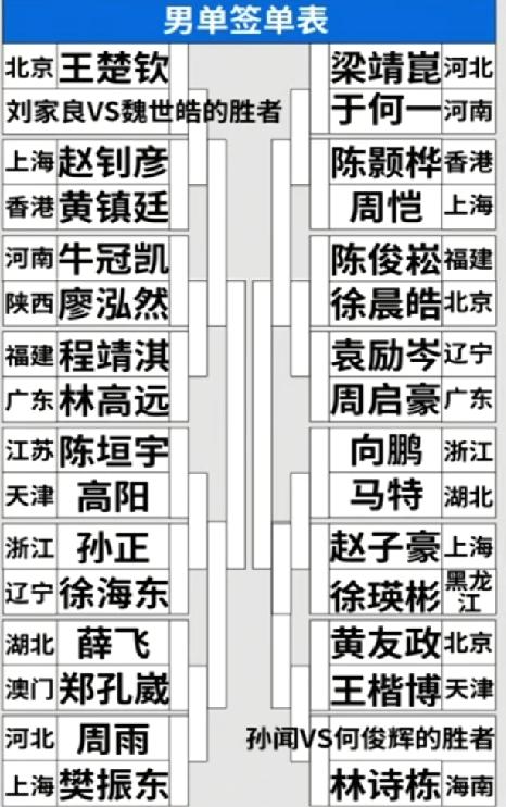 王楚钦、樊振东“谁主沉浮” 全运会男单签表已出, 万万没想到王楚钦和樊振东, 落到了同一个半区, 注定他们其中一个不能夺冠。 全运会男单签表出来了, 可惜的是王楚钦和樊振东, 他们在同一个半区。 也就是半决赛他们必须淘汰一个, 怎么能这么“残忍”, 他俩都喜欢的怎么办呢。 看到黄镇廷的签位就想笑, 又落到了王楚钦的1/8区, 大圣打高端局的含金量还在上升。 下半区有梁靖崑、向鹏、林诗栋, 不知道这次谁能领衔下半区, 冲入男单决赛。 (图片源自于网络)