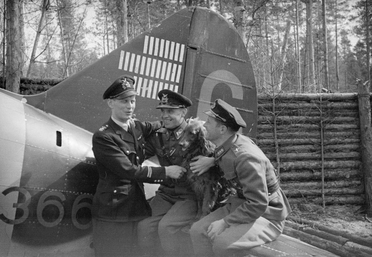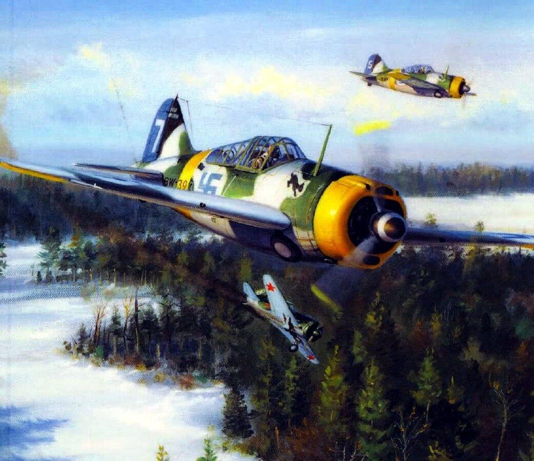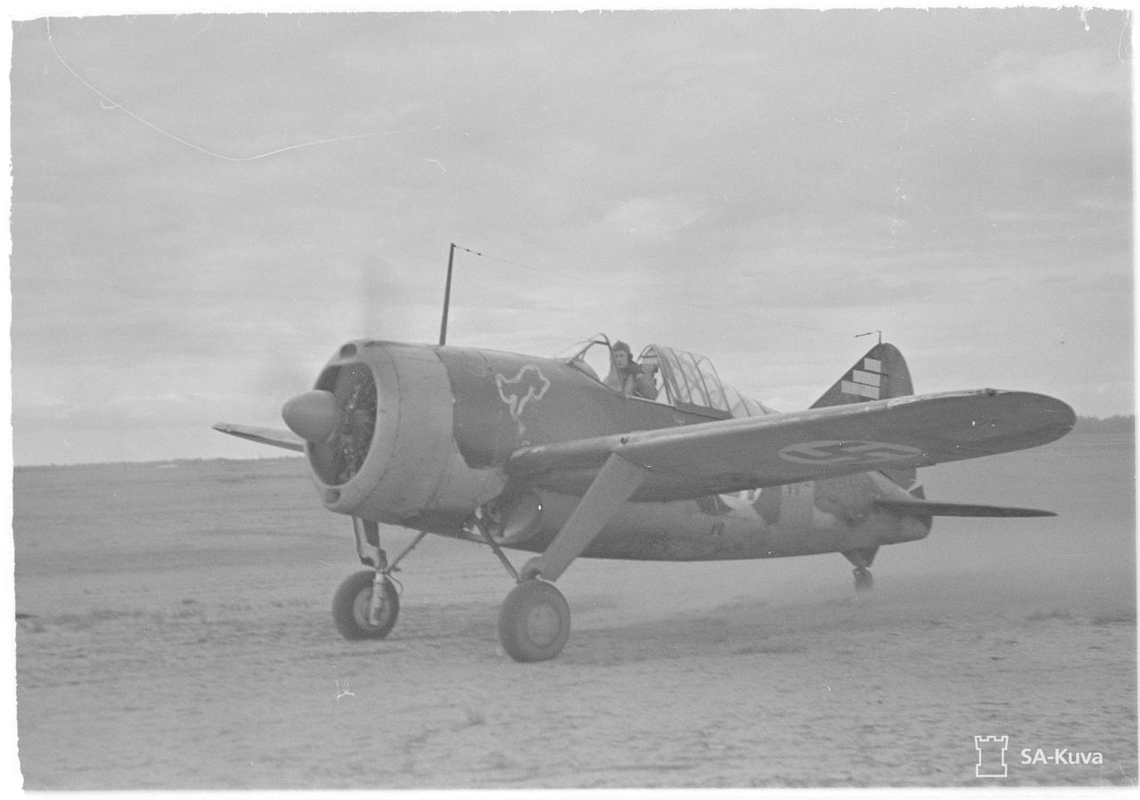 [呲牙] 王牌飞行员的合影,3个人的战绩为69架——1943年,芬兰空军第24中队(LeLv 24)的王牌飞行员们在美制布鲁斯特B-239战斗机垂尾前合影。从左至右分别为: 1.汉斯·温德(1919-1995),昵称“哈西”",当时战绩25架,后成为芬兰顶尖王牌; 2.准尉图尔卡,昵称“莉安娜”,战绩15架; 3.约尔马·卡尔胡宁(1913-2002),时任第24中队长,战绩29架。 芬兰空军第24中队(LeLv 24)是芬兰空军主力战斗机中队,1941-1944年共击落477架敌机,战损比达32:1。 布鲁斯特B-239(参见图2~3)是美国F2A"水牛"战斗机(参见图4)的芬兰出口型,配备950马力莱特R-1820发动机,最大时速483公里,芬兰空军共获得44架。