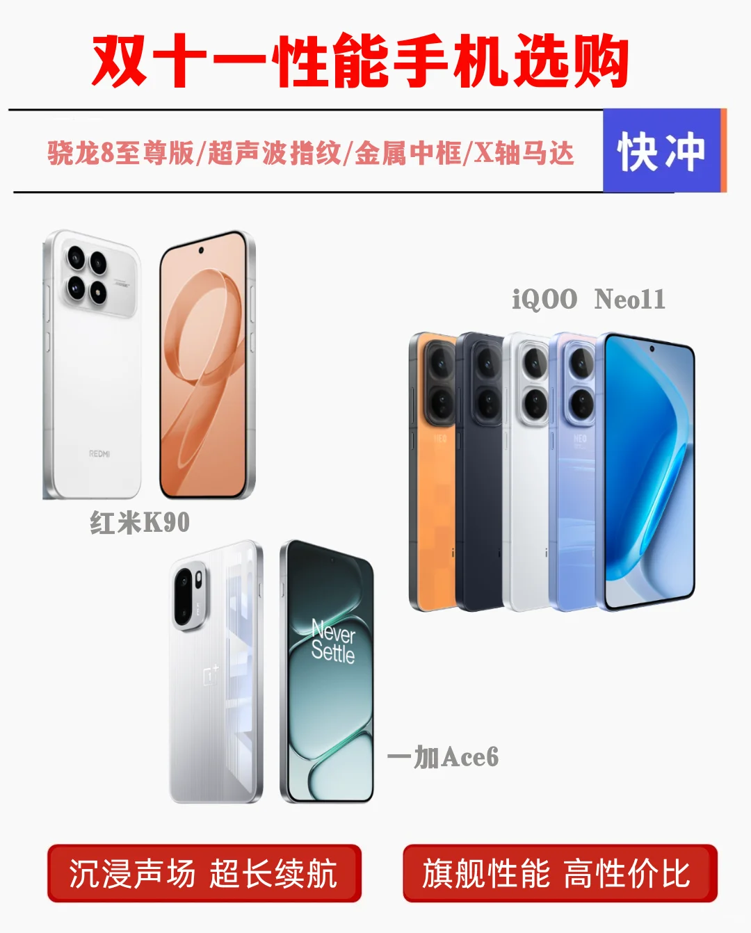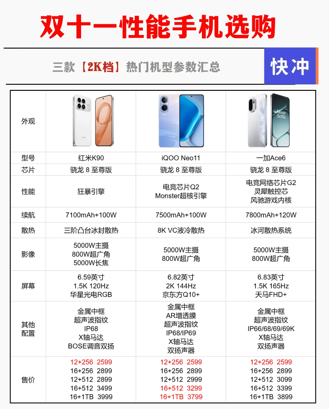 知道今年高端旗舰鲨得猛 就是没想到2K价位的性能手机也很内卷 越卷,性价比越高,我们作为消费者自然喜闻乐见 加上双/十/一狂欢也来了,现在正是2K档换新机的好时机 大家记得码住这篇笔记,参考我下面列出来的三款全新性能手机 分别是红米K90、iQOO Neo11、一加Ace6 首销起步价都是2599 省流版看参数~ 详情版👇 共同点: 骁龙8至尊版、超声波指纹、金属中框、X轴马达这些都有,就不多说了 差异点: 📱红米K90往影音倾斜 多了颗长焦镜头,双扬也做了bose联合调音 📱iQOO Neo11还是继续电竞性能赛道 144Hz+2K屏,属于新机潮同档唯1️⃣的组合,而且屏幕还是京东方Q10+材料 峰值亮度高,户外看得清楚 又有iQOO 15同款的AR增透膜,显示更清晰了 搭配电竞芯片Q2+Monster超核引擎,支持2K+144帧超分超帧并发 原神的2K+90fps超分超帧一样能造 游戏党一玩一个不吱声,各项体感拉满 📱一加Ace6重心放在续航 这点有目共睹 电池容量干到7800mAh,快充也有120W,续航焦虑不存在 大家按差异点去选择,踩坑概率小 我自己打算冲Neo11,对性价比敏感,这次想入的16+512GB大内存版本我看Neo11比其他两款都要便宜,真的心动了 性能手机2K档红米K90iQOONeo11一加Ace6手机推荐好物分享双十一攻略