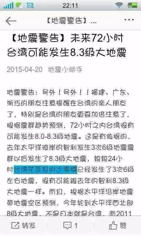 8级以上大地震前会有什么征兆? 今天台湾发生了三次六级以上大地震,看到一些不知真假的地震预测,希望各位知友能否提供专业知识加以佐证。半夜语无伦次来提问,现在题主很惶恐(; ̄ェ ̄) 以下是亲身经历: 关于2008年5月12日汶川大地震。当时我上小学六年级,坐标皖北农村。记得非常清楚,5月11日(周日,没上学)上午大概11点左右,我坐在老房子(砖瓦房)门边地上逗蚂蚁,突然感觉地面晃了一下,像是波浪那种感觉,房子簌簌的掉灰,吓得我赶紧跑到外面喊奶奶,我奶奶也感觉到了地震,边摘菜边淡定的说:“没有事,地在翻身呢。”后来下午就去上学了,当时是在寄宿学校,没有手机,难以接触外面的信息,过了几天学校统一组织捐款才知道,5月12号四川发生了大地震。结合周日的亲身感受,第一反应就是当时这个消息要是能传递到国家层面,是不是就可以引起重视,很大程度上避免这么多伤亡和损失。