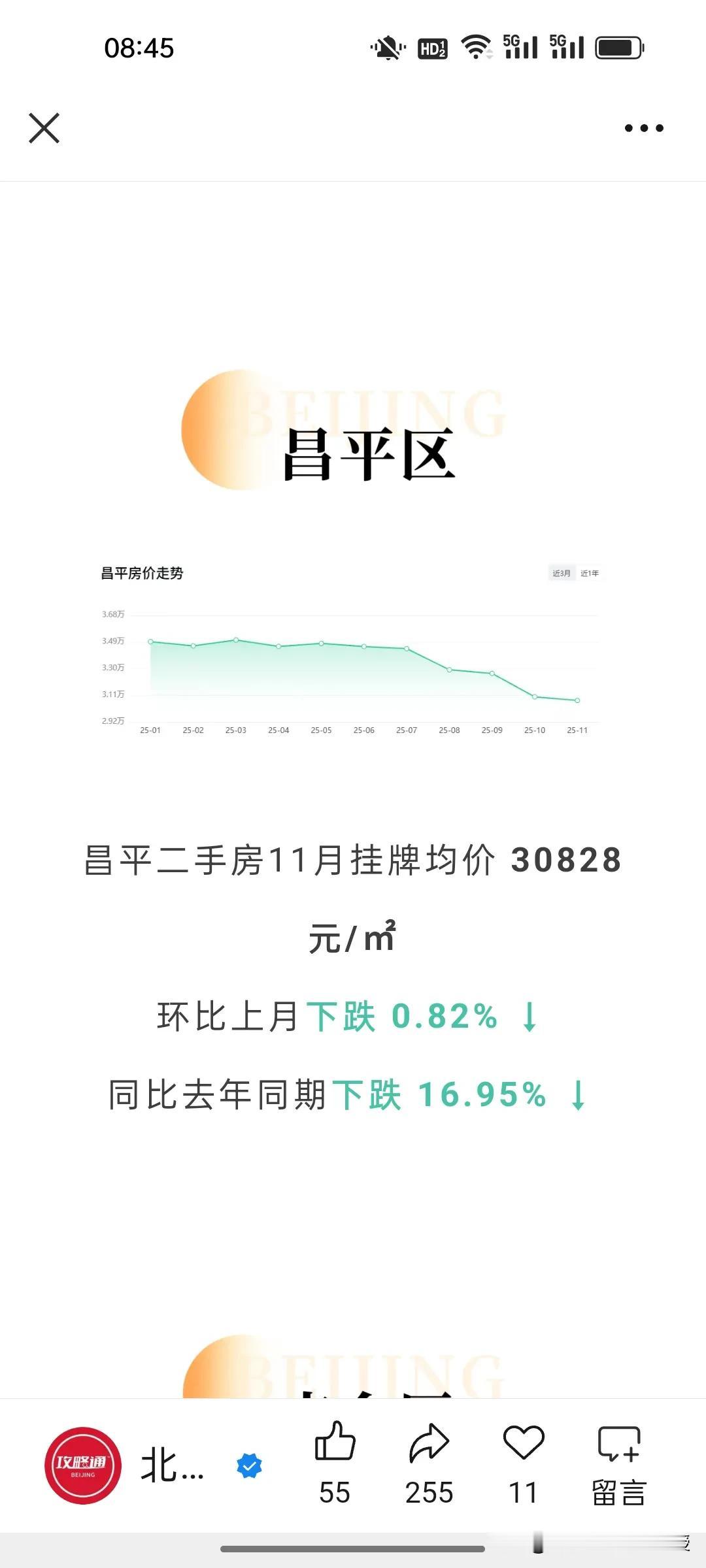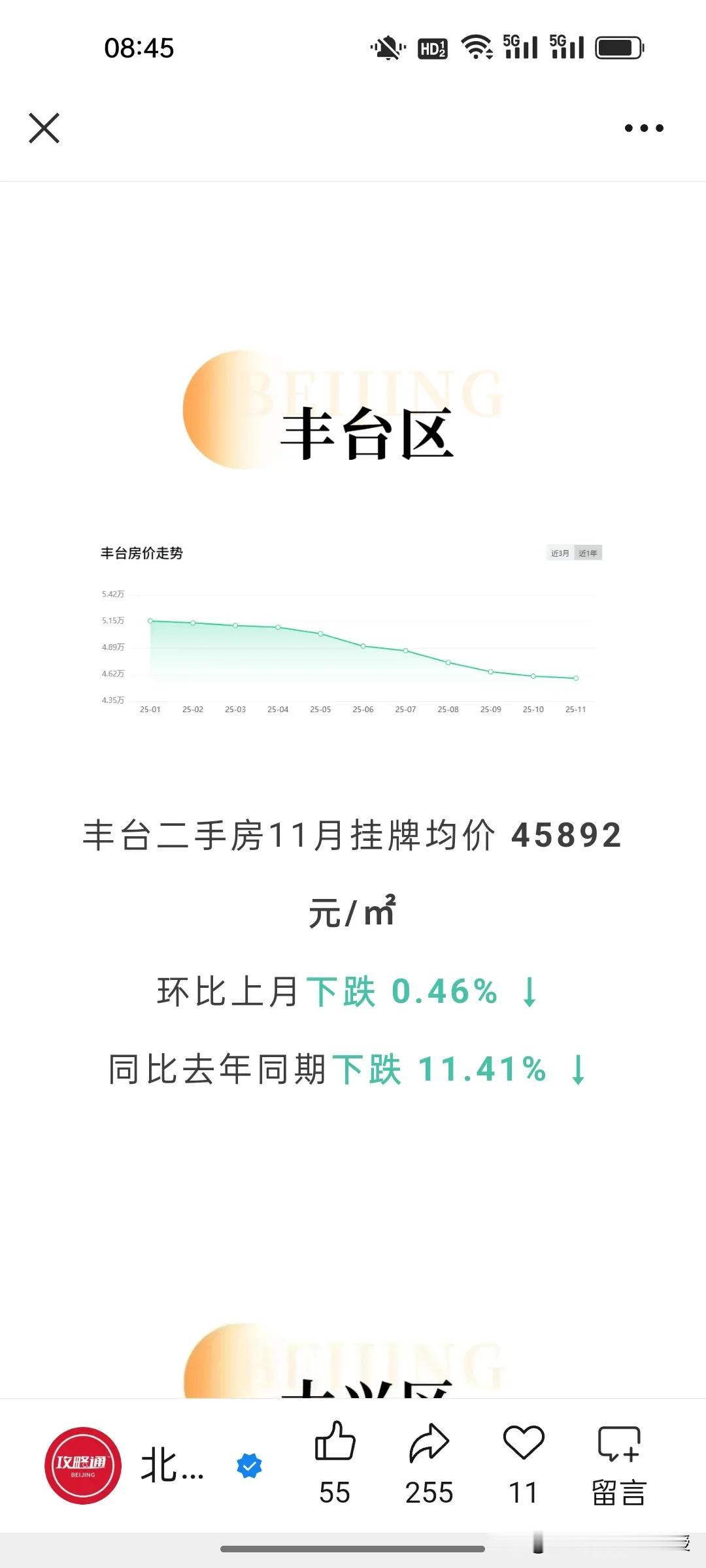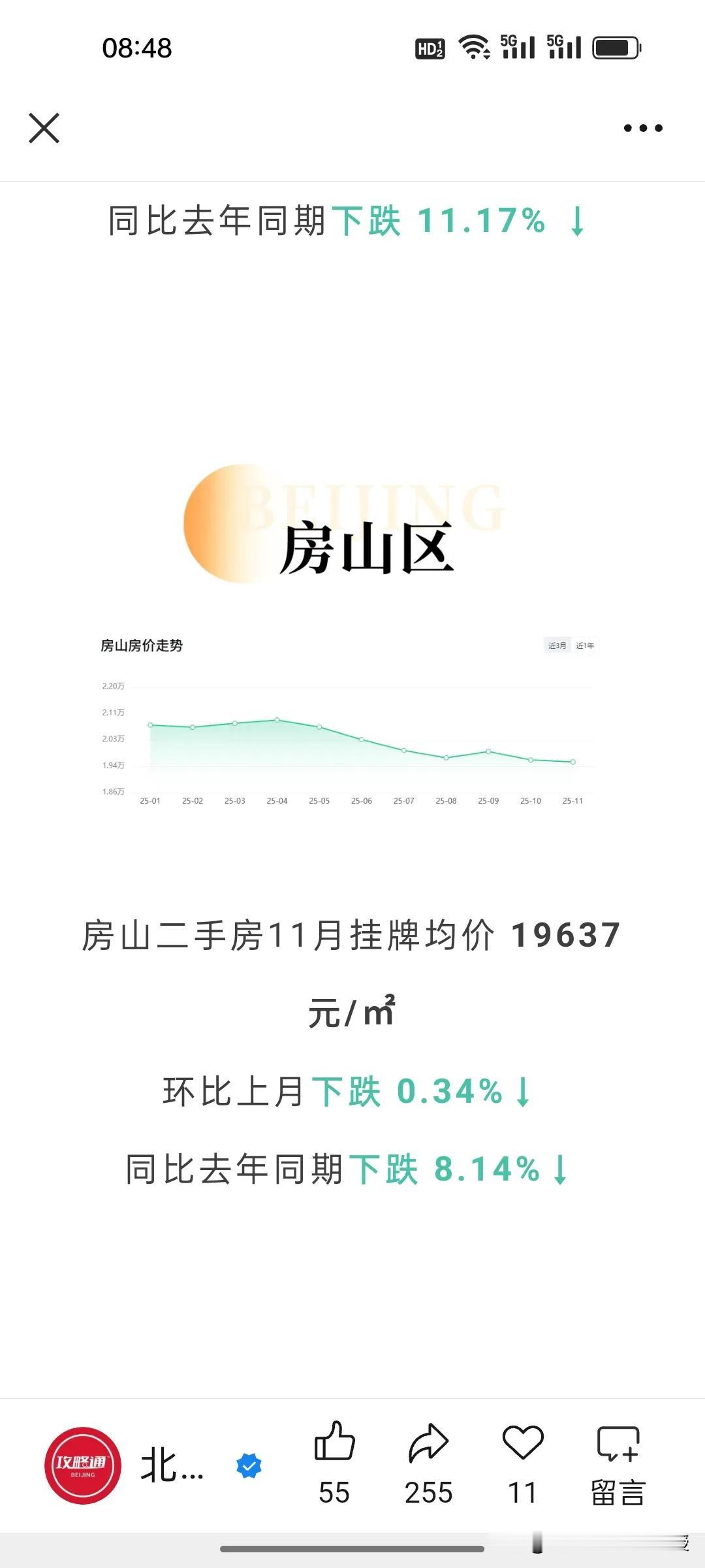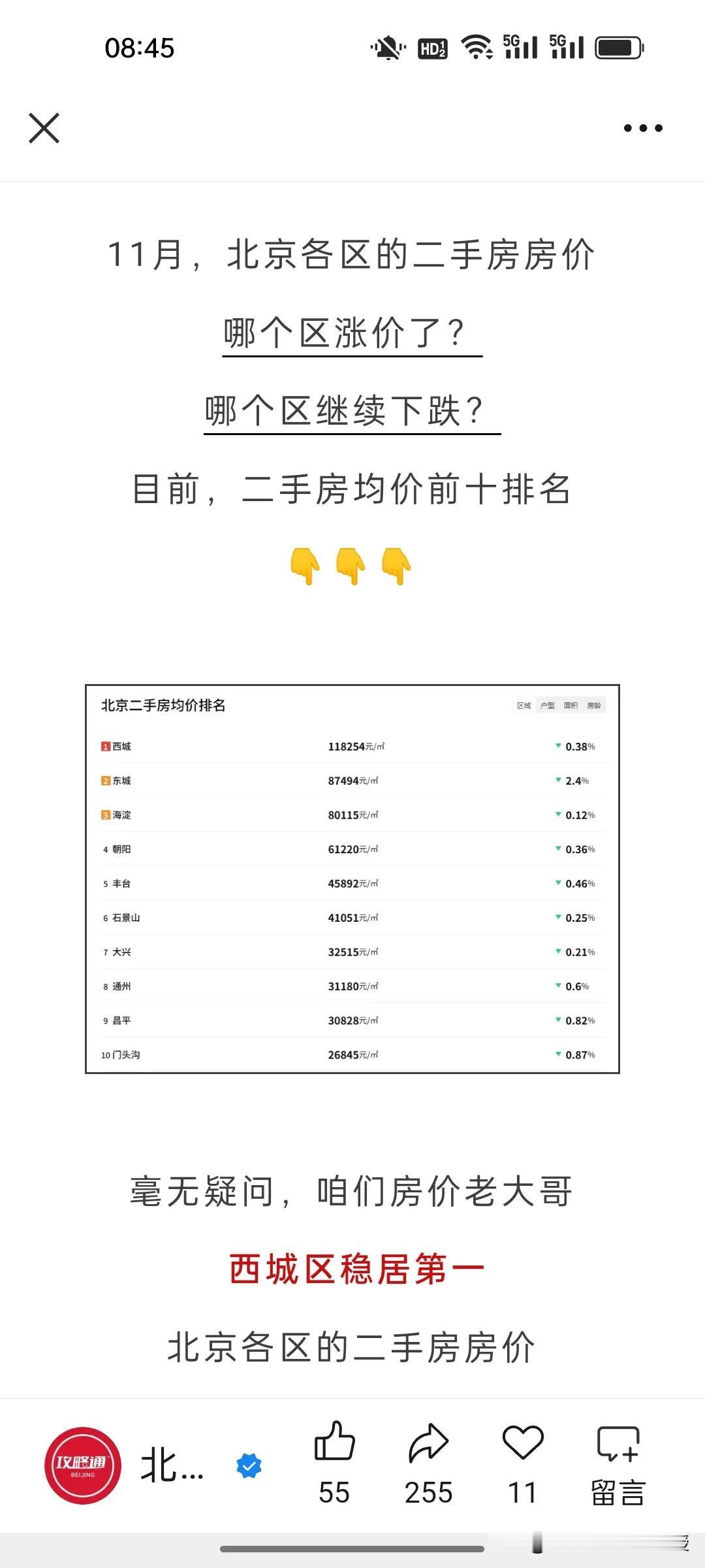 看下图,北京最新的11月房价统计,比去年同期下跌了7.33%,北京的房价已经回到12年前了。当然,最抗跌的就是西城区,毕竟是黄金地段,寸土寸金。跌幅最深的还是远郊区,比如门头沟和昌平,相比去年同期都下降了17%。 现在很多网友说,如果今年买房比10年前买房要少奋斗20年。这句话放在大城市尤为合适。 不过,值得注意的是,尽管北京多区房价普跌,但是现在一线城市黄金地段的房子依旧受买家欢迎,因为其抗风险能力强。最近一段时间上海静安和黄浦区多个接近一个小目标的高端楼盘都是秒罄,北京西城区的房价也依旧坚挺,这个两极分化的趋势在未来很长一段时间会延续。