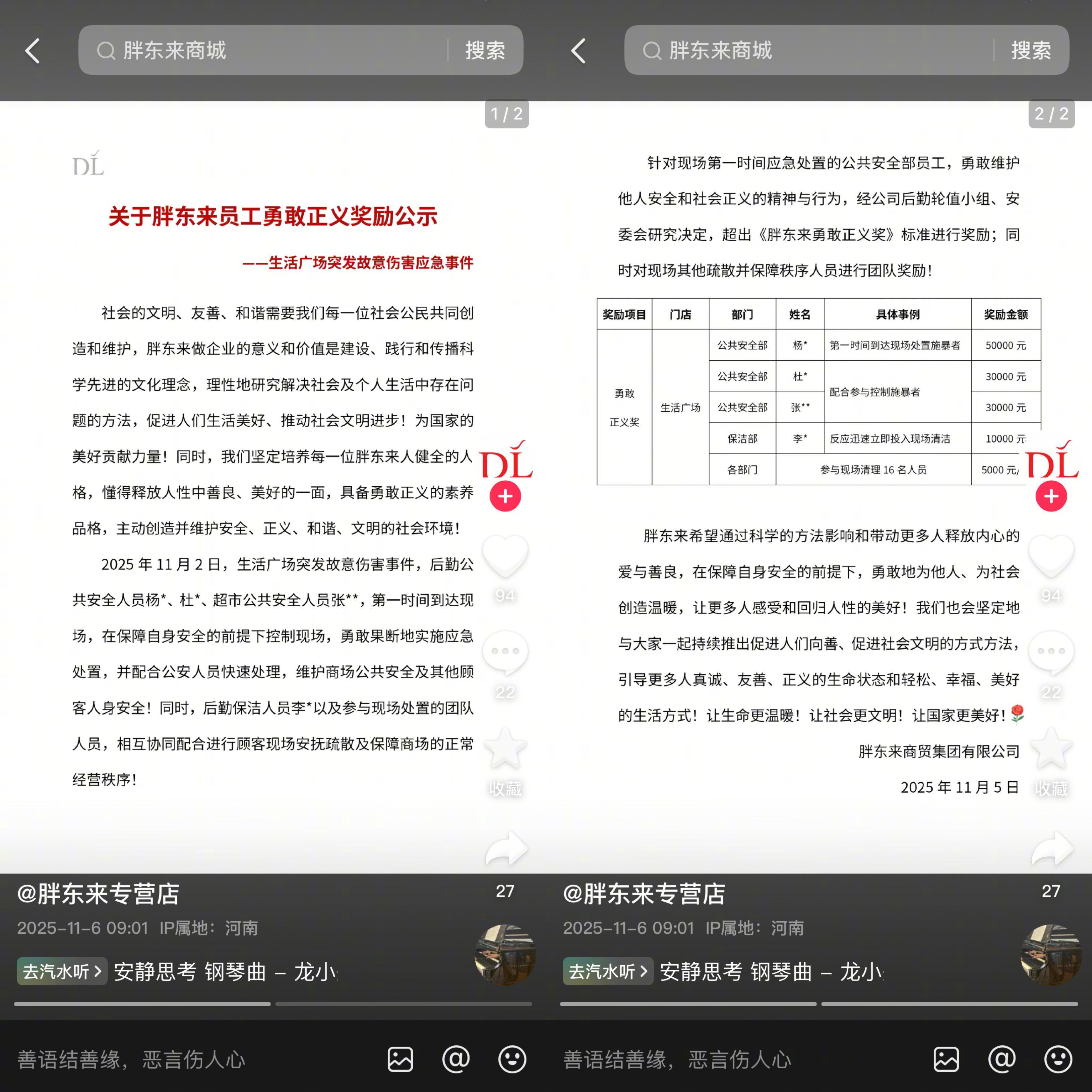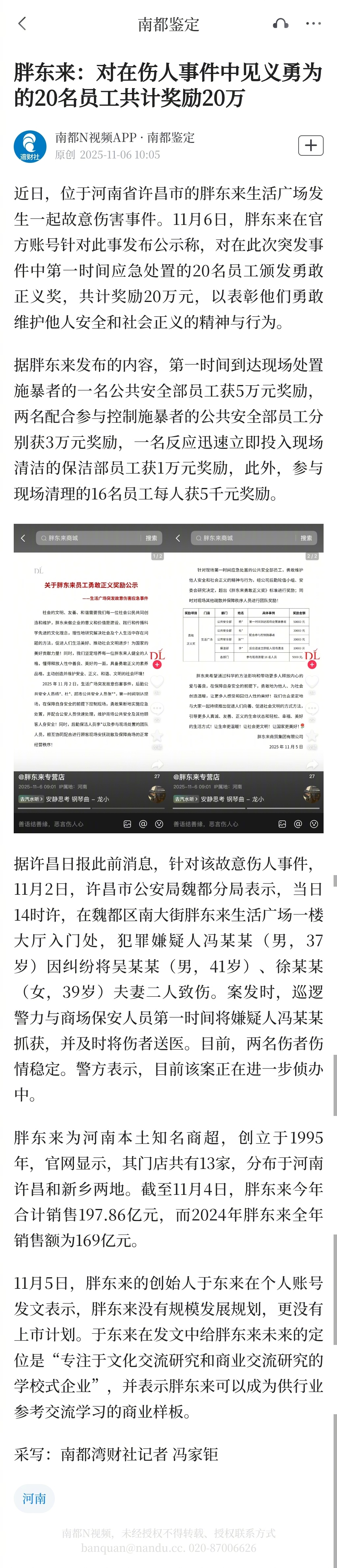 #胖东来20名员工见义勇为奖励20万#【胖东来:对在伤人事件中见义勇为的20名员工共计奖励20万】#胖东来20名员工在伤人事件见义勇为#近日,位于河南省许昌市的胖东来生活广场发生一起故意伤害事件。11月6日,胖东来在官方账号针对此事发布公示称,对在此次突发事件中第一时间应急处置的20名员工颁发勇敢正义奖,共计奖励20万元,以表彰他们勇敢维护他人安全和社会正义的精神与行为。
