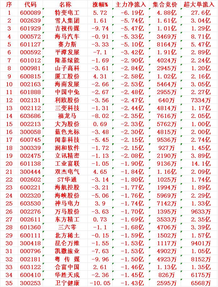 11月6日开盘45分钟,主力资金“卖出的 ”35名单! 特变电工:净流出 6.19亿元 雪人集团:净流出 5.74亿元 吉视传媒:净流出 5.47亿元 海马汽车:净流出 5.33亿元 赛力斯:净流出 5.10亿元