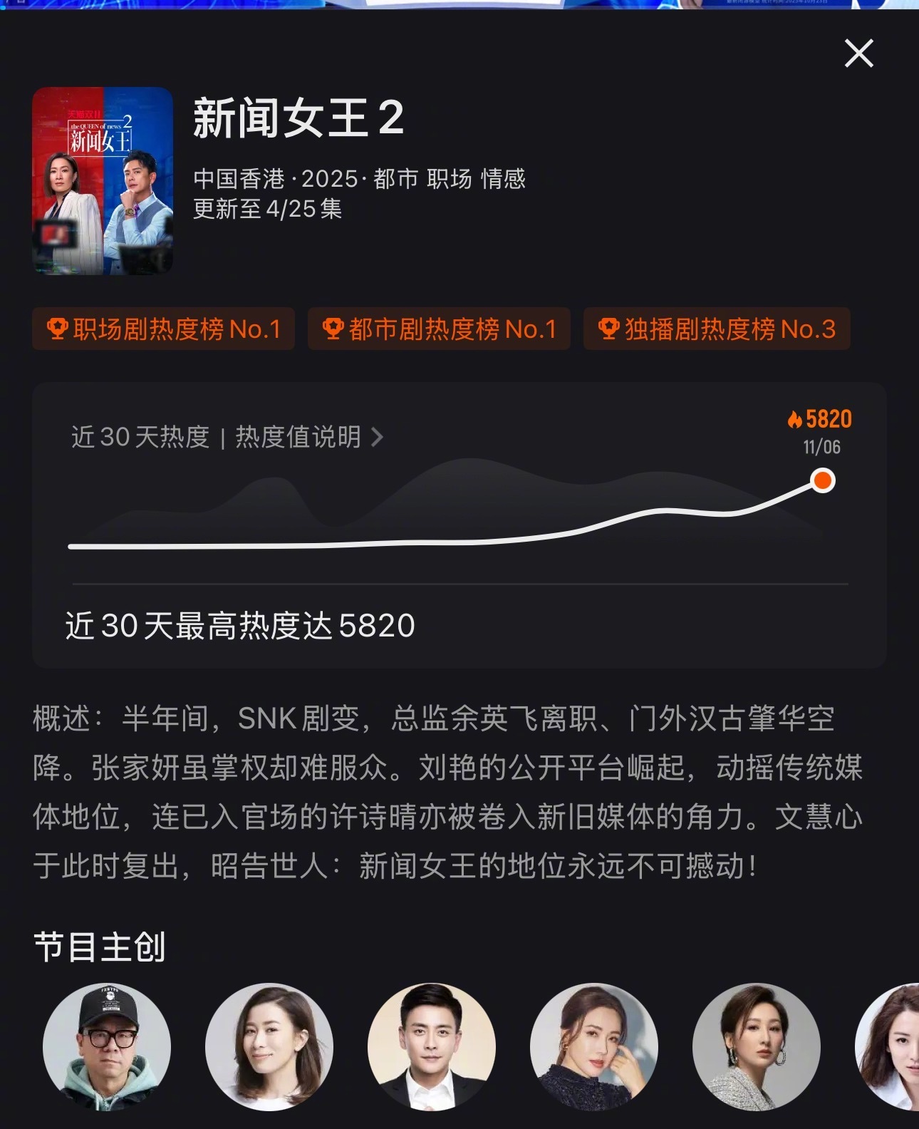 新闻女王2首播热度逼近6000,起点热度4070,首日最高热度5714。首日涨幅1644,目前涨幅为👖年度第1,港剧真的是纯靠剧情来顶[good]