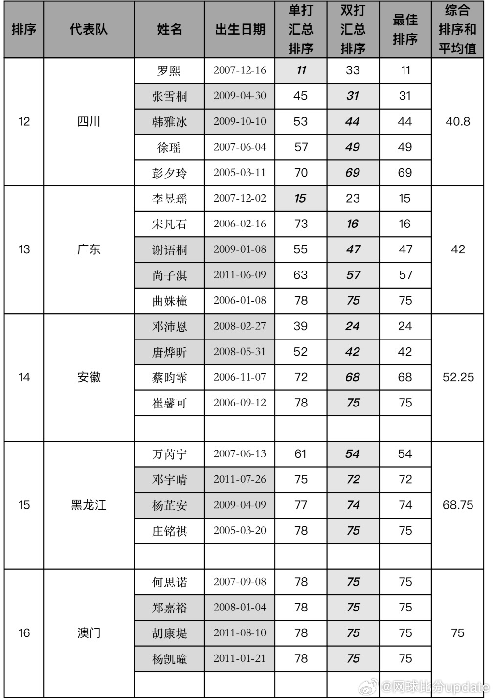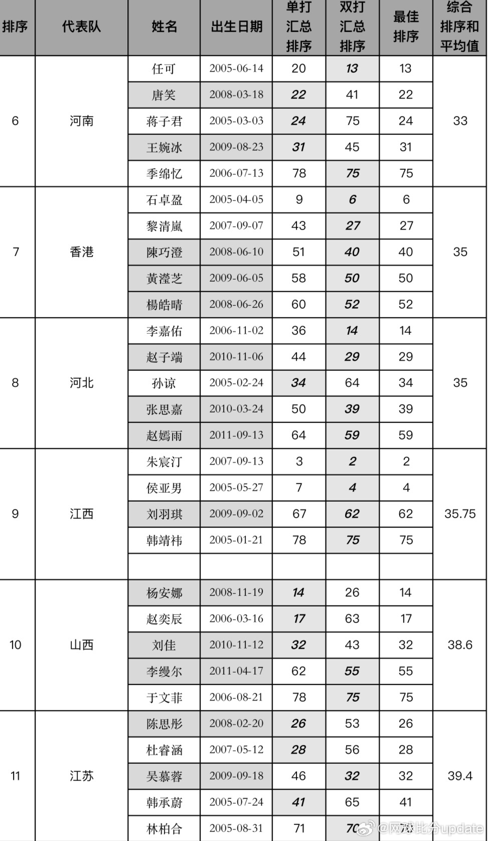 天津队孙颖群领衔、湖北队主力都是魏彰倩、吴汝茜、耿心乐这些U17 小朋友们。 浙江竞争力也很足 叶师羽、邹瑞瑞、渠依含
