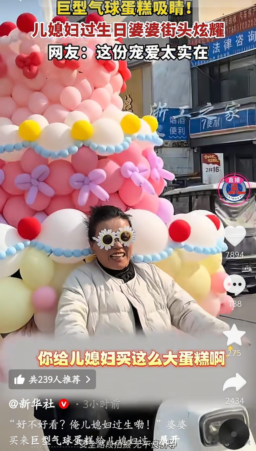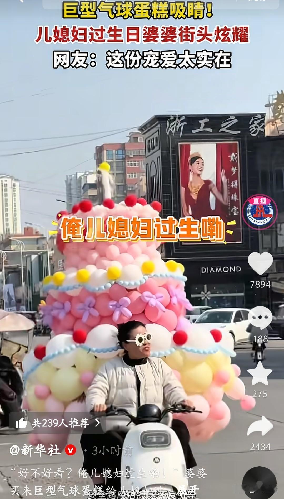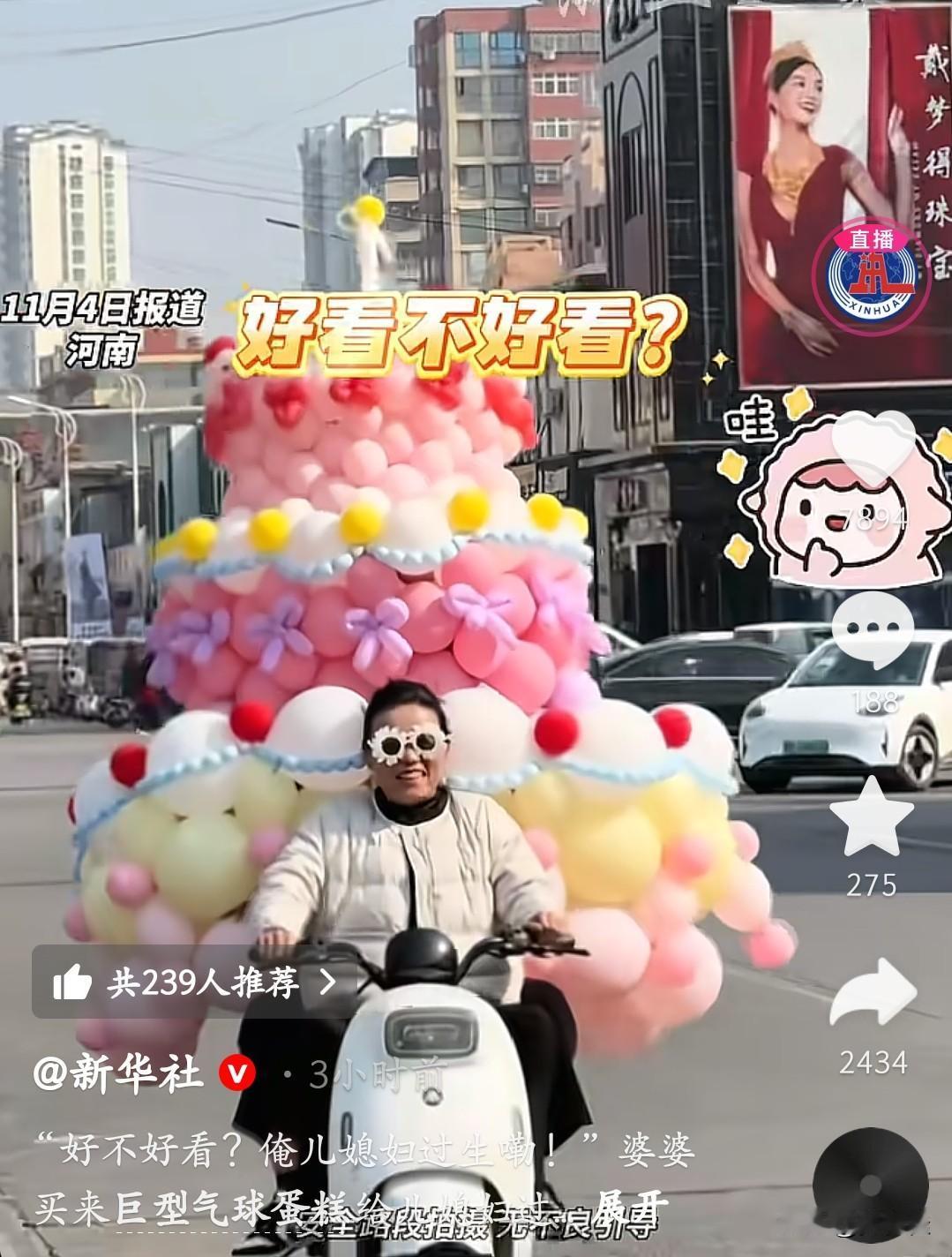 这是谁的婆婆啊,我也想要同款!! 你瞅这阿姨骑电车驮着老大个气球蛋糕,嘴都咧到耳根子了:“俺儿媳妇过生日!”粉的黄的气球堆成小山,蝴蝶结、小绒球都透着娇,这哪是庆生啊,明明是把“宠儿媳”挂街上显摆! 谁能不眼红这明晃晃的偏爱啊?婆婆把儿媳宠成整条街最甜的崽,连风都跟着沾喜气!这哪是气球蛋糕,是把“我家儿媳我疼着”贴路人脑门上了! 这婆婆是国家统发不?我现在排队领一个中不?这实打实的宠法,直接把“神仙婆媳”焊我心巴上了!